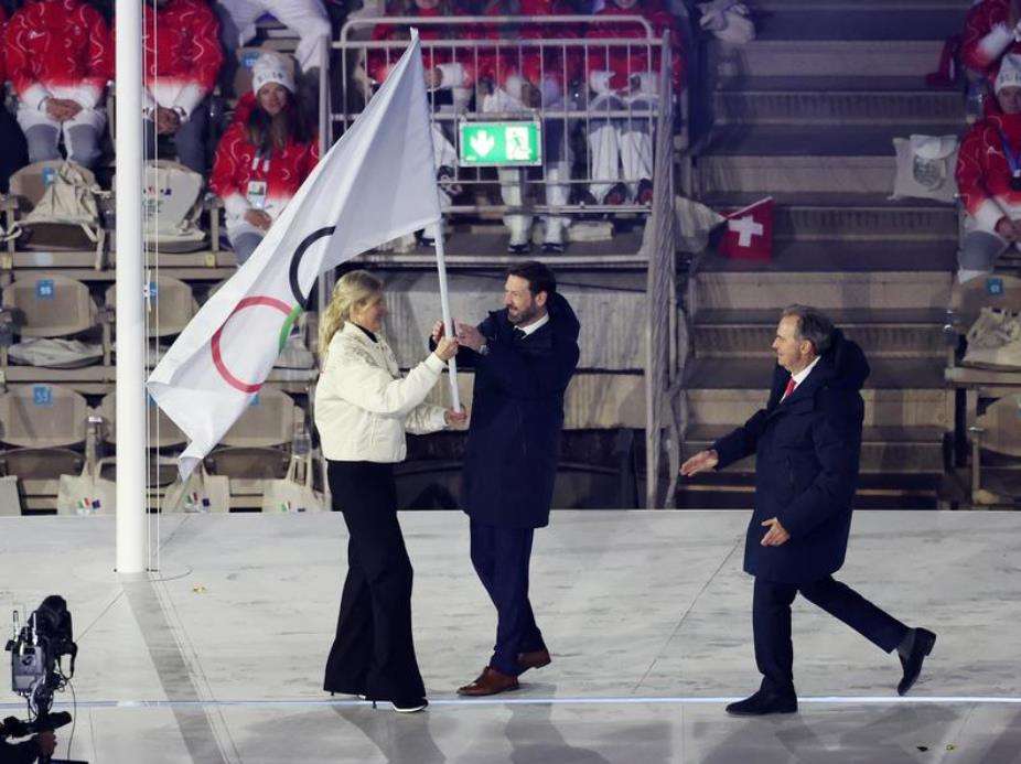 国际奥委会主席考文垂(左)和下届冬奥会举办地法国普罗旺斯-阿尔卑斯-蓝色海岸大区及奥弗涅-罗讷-阿尔卑斯大区代表在闭幕式上交接奥林匹克会旗。新华社