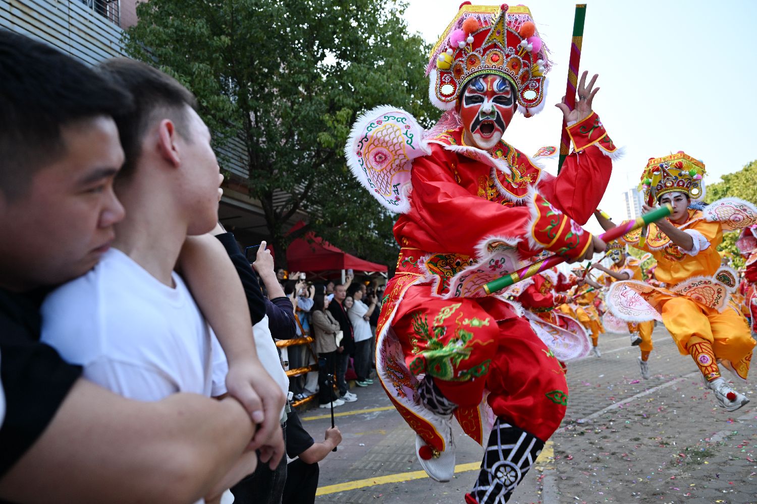 马年春节期间,中国多地举办多彩民俗活动,年味十足。图为2月22日,凤岗英歌队在广东汕头潮阳区表演英歌舞。英歌舞融戏剧、舞蹈、武术于一体,长期流传于广东汕头潮阳、潮南和揭阳普宁等地。中新社