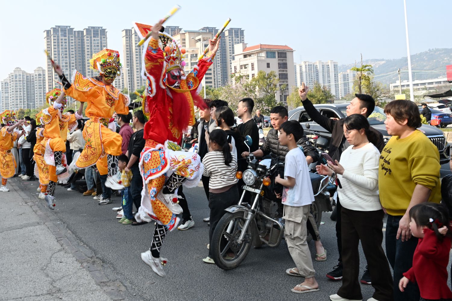 2月22日,凤岗英歌队在广东汕头潮阳区表演英歌舞,吸引民众观看。中新社