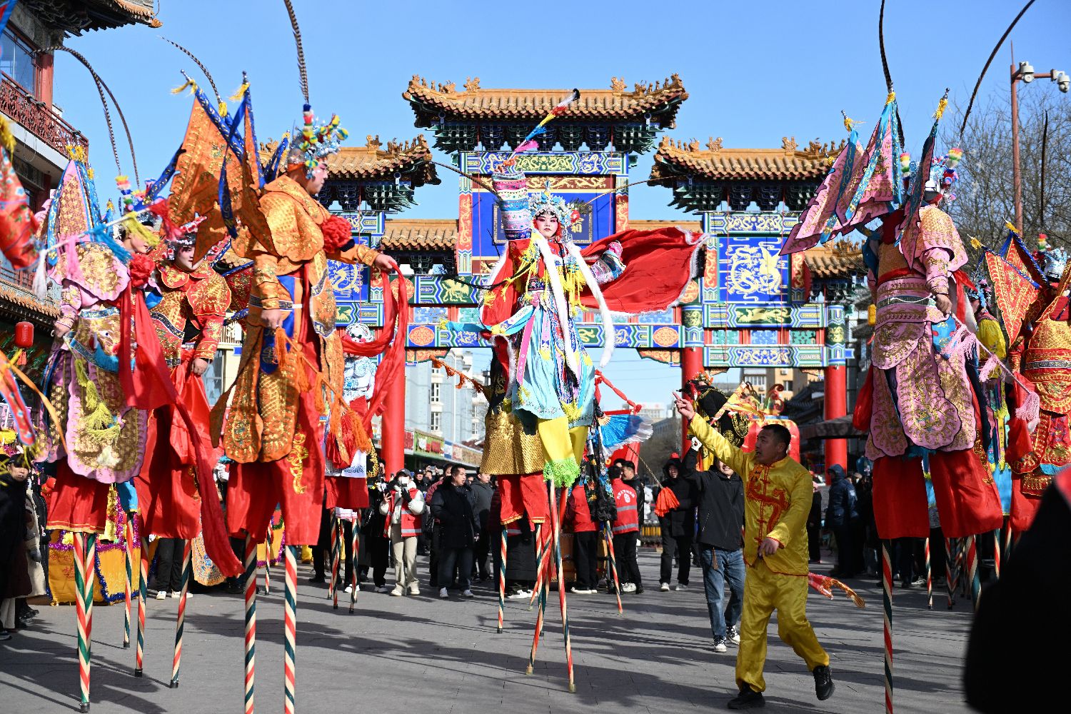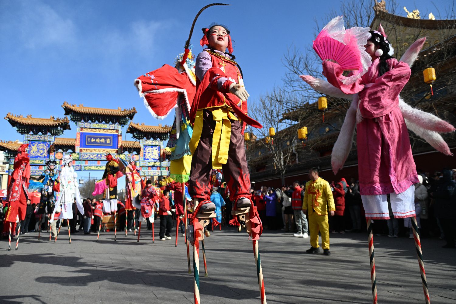 2月22日,内蒙古呼和浩特玉泉区大召春节庙会迎客流高峰,踩高跷、扭秧歌等民俗精彩上演。中新社