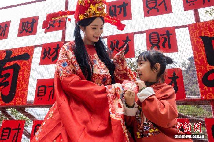 2月21日,在广西来宾金秀瑶族自治县大瑶山盘王界景区,“财神”给一位小朋友派发红包。中新网