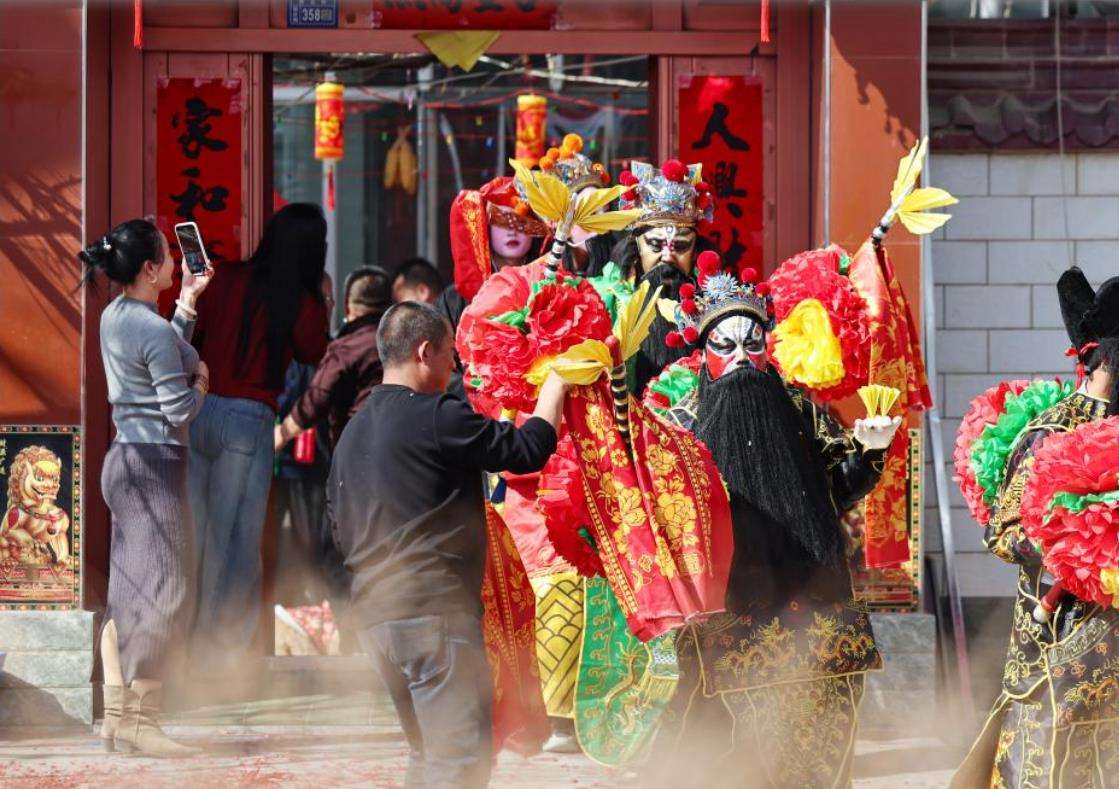 2月21日,在甘肃省静宁县仁大镇,社火队员走家串户表演。新华社
