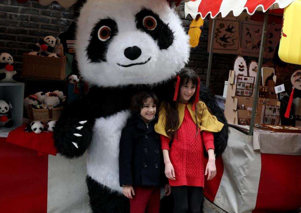 两名女孩在活动上和大熊猫人偶合影。新华社