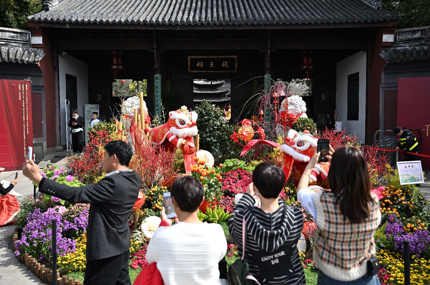 近日,随着影视剧《太平年》热播,不少游客在浙江杭州西湖打卡钱王祠、雷峰塔等景点,感受剧中的吴越文化。图为2月23日,游人在钱王祠拍摄《太平年》主题的新年装饰。中新社