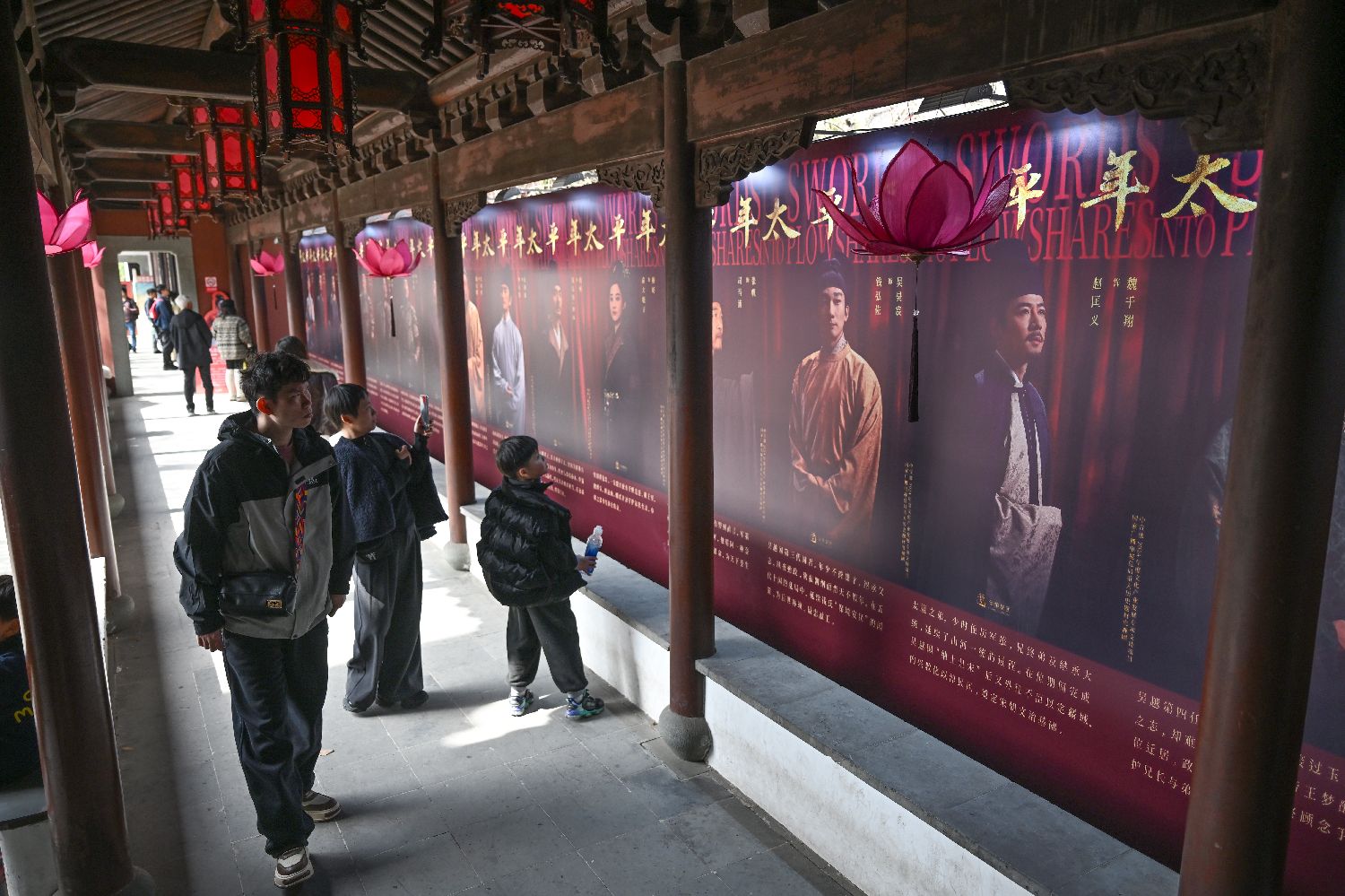 2月23日,游人在钱王祠观看《太平年》中的人物简介。中新社