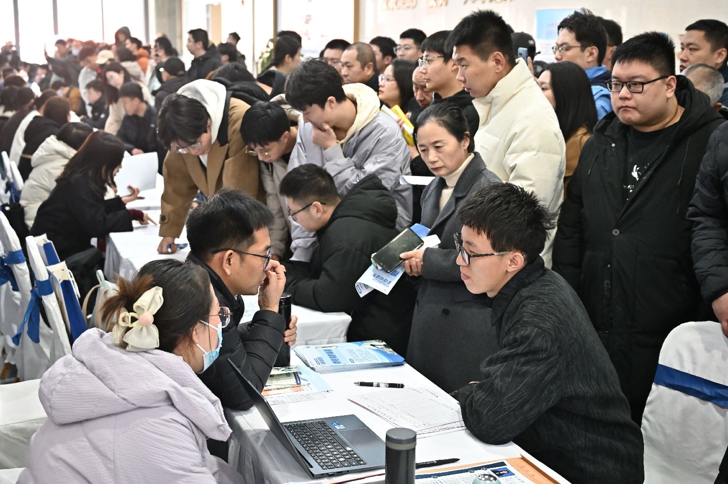 2月24日,求职者在江苏海安2026春风行动暨就业援助季专场招聘活动现场与用人单位交流就业信息。新华社