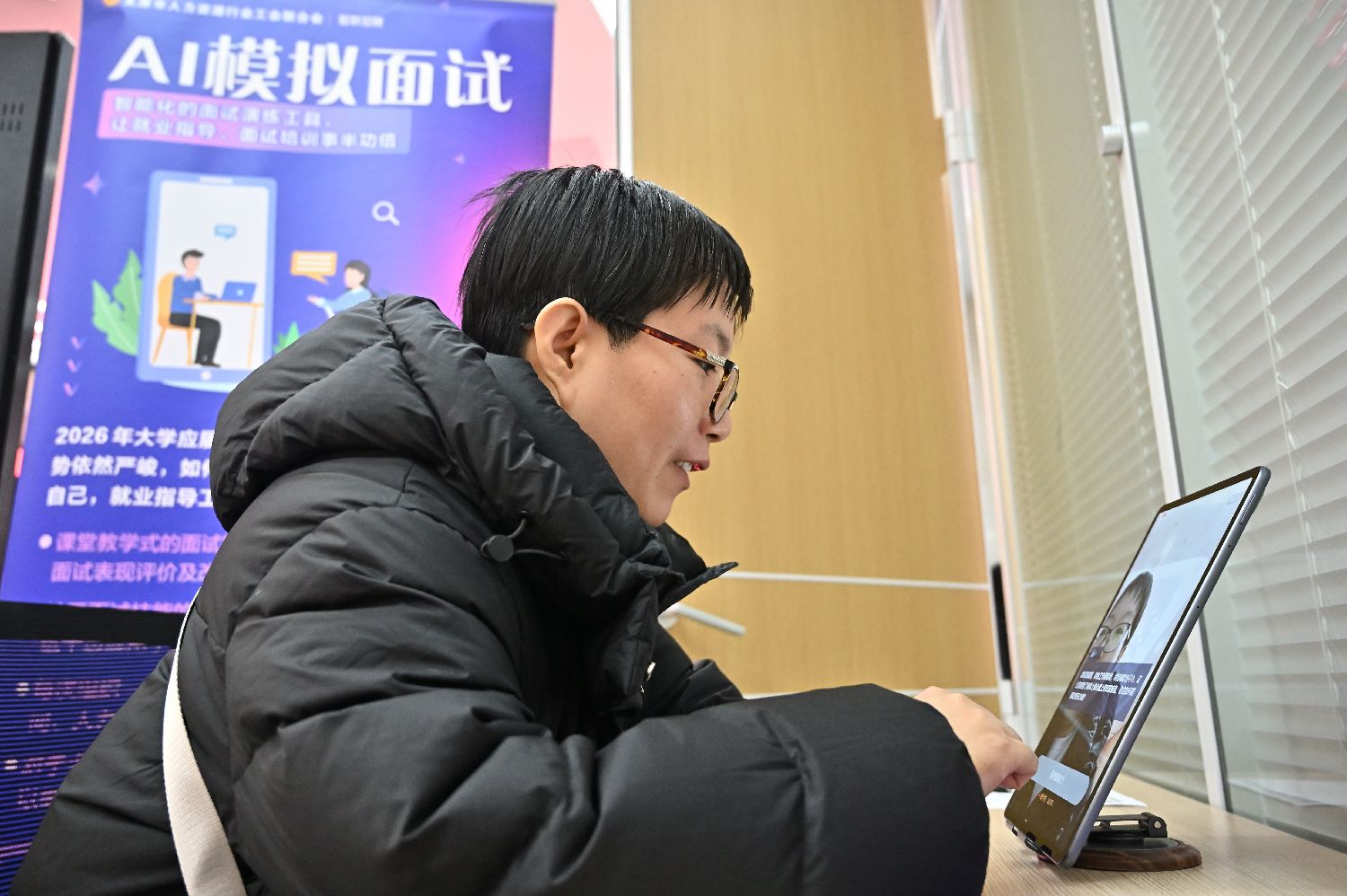 2月24日,在山西太原的新春首场大型招聘会上,求职者体验AI模拟面试。中新社