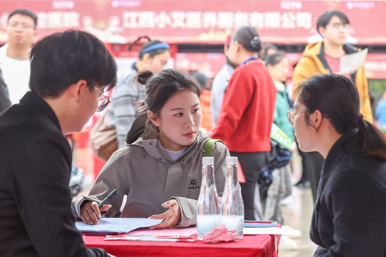 2月24日,在江西赣州2026年春风行动暨就业援助季就业招聘大会现场,求职者与企业工作人员交谈。中新社