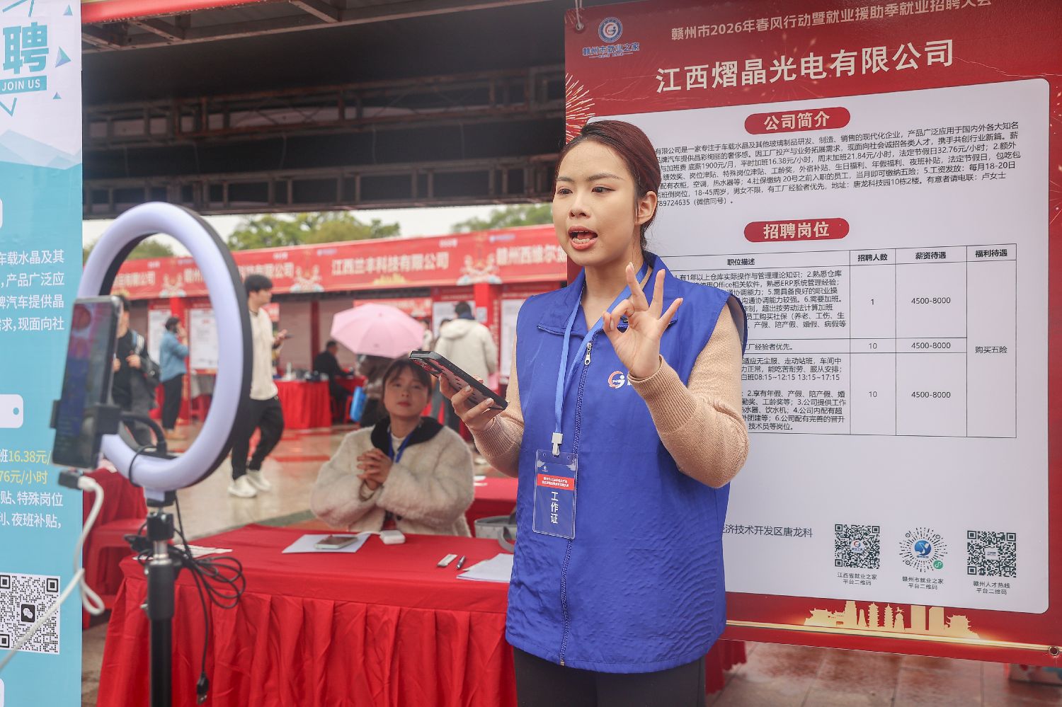 2月24日,在江西赣州2026年春风行动暨就业援助季就业招聘大会现场,一家企业工作人员进行直播招聘。中新社