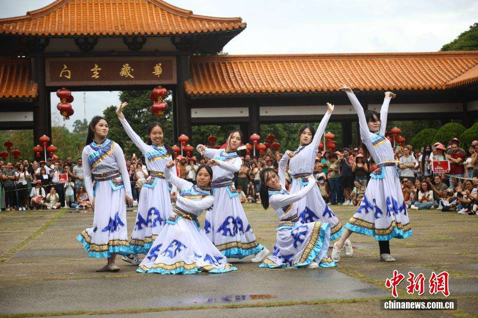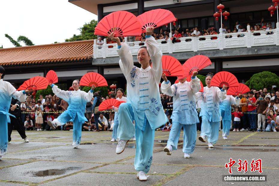 2月22日,巴西佛光山如来寺(TemploZuLai)举办万人新年庆典活动,巴西圣保罗北京文化交流协会、圣保罗华星艺术团、巴西坎皮纳斯州立大学孔子学院和巴西圣保罗太极功夫班共襄盛举。活动吸引逾两万中巴游客香客参与,共同欣赏中华传统文化演出,为家人、社区和世界祈愿和平与繁荣。如来寺坐落于圣保罗州科蒂亚市(Cotia),是由星云大师创办的拉丁美洲最大佛教寺院,占地约2020万平方米。图为巴西北京文化交流协会表演太极双扇《精忠报国》。