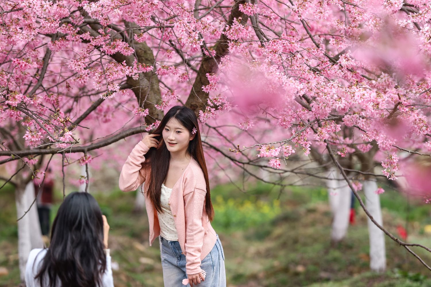 随着气温升高,中国多地出现“春花”争艳的景色,吸引民众前往踏春游览。图为2月24日,在贵州黔南布依族苗族自治州贵定县盘江镇樱花园,游客赏花拍照。中新社