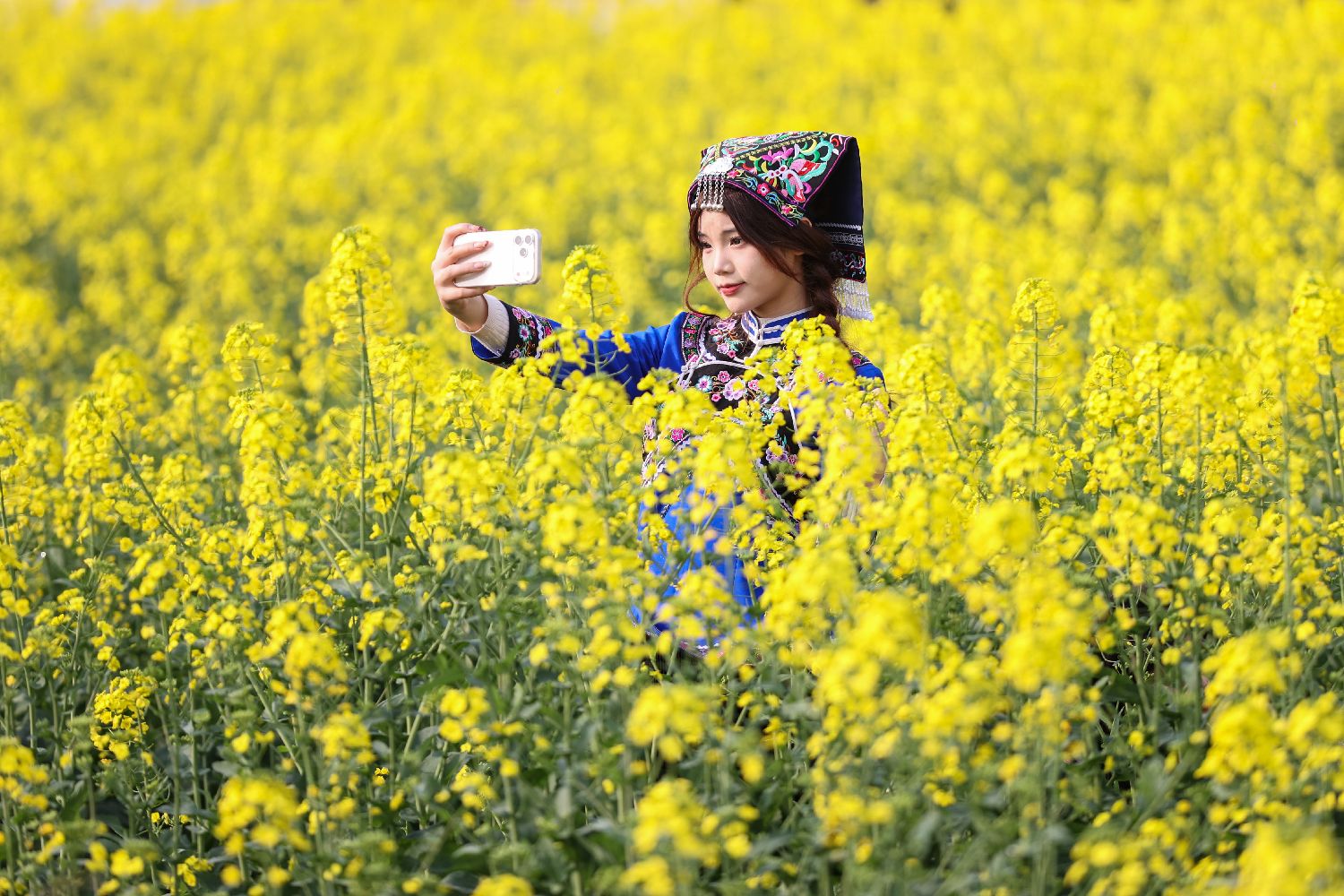 2月24日,游客在贵州黔南布依族苗族自治州贵定县金海雪山油菜花田里自拍。中新社