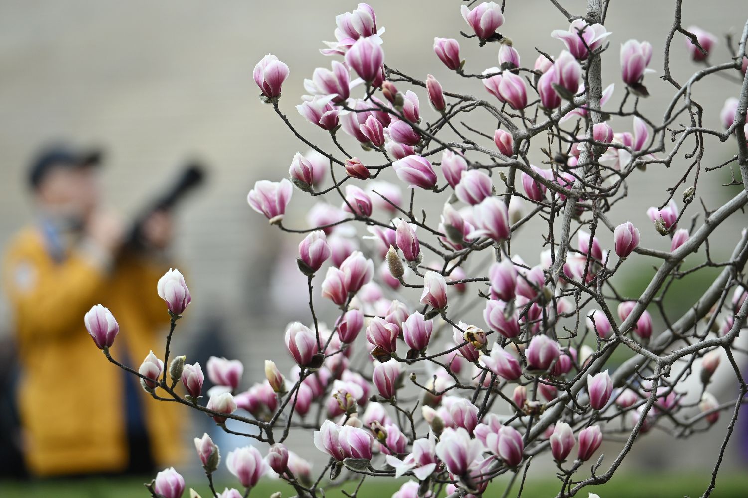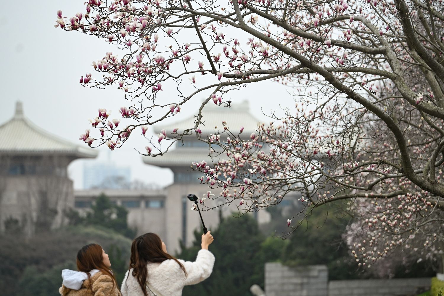 2月25日,江苏南京雨花台风景名胜区内,游客拍摄宝华玉兰。 中新社