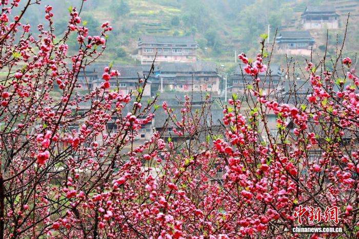 近日,广西三江侗族自治县八江镇归令村三合屯的桃花竞相绽放,盛开的桃花与侗寨民居相互映衬,勾勒出一幅“村在景中、景在画中”的诗意画卷,吸引民众前往“打卡”拍照,共赴春日之约,尽享乡村之美。图为2月25日,桃花映衬下的侗寨美景。中新网