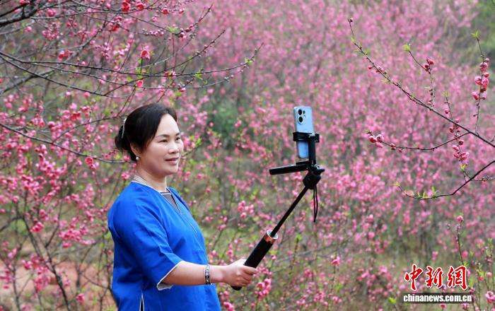 2月25日,在广西三江侗族自治县八江镇归令村三合屯,一位女士走进桃花林自拍。中新网