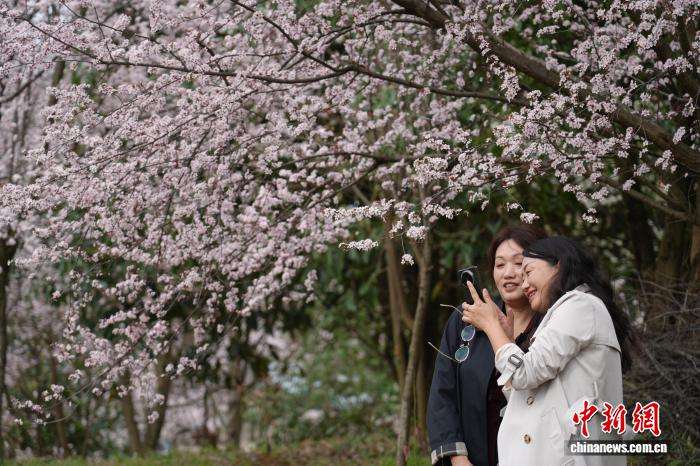2月25日,民众在贵州贵阳花溪区桂香路的花树下拍照。中新网