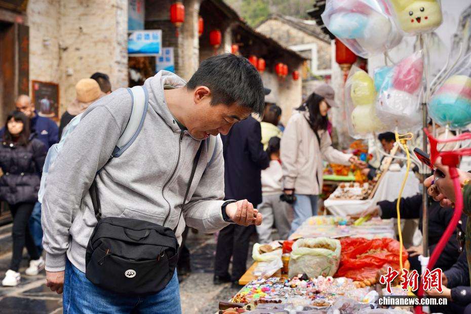游人在古镇摊位前挑选商品。