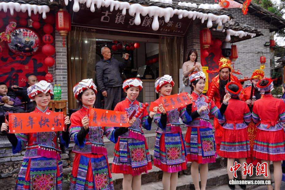 游人在古镇赏民俗表演。