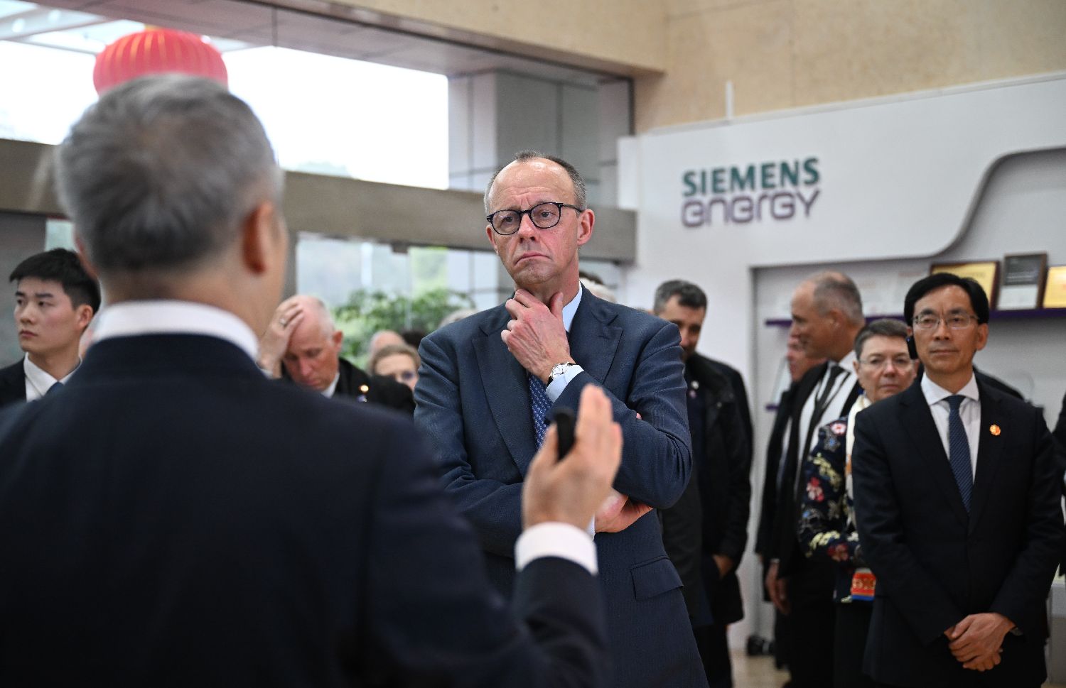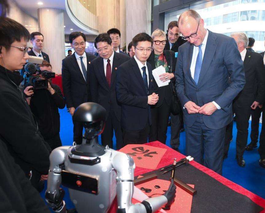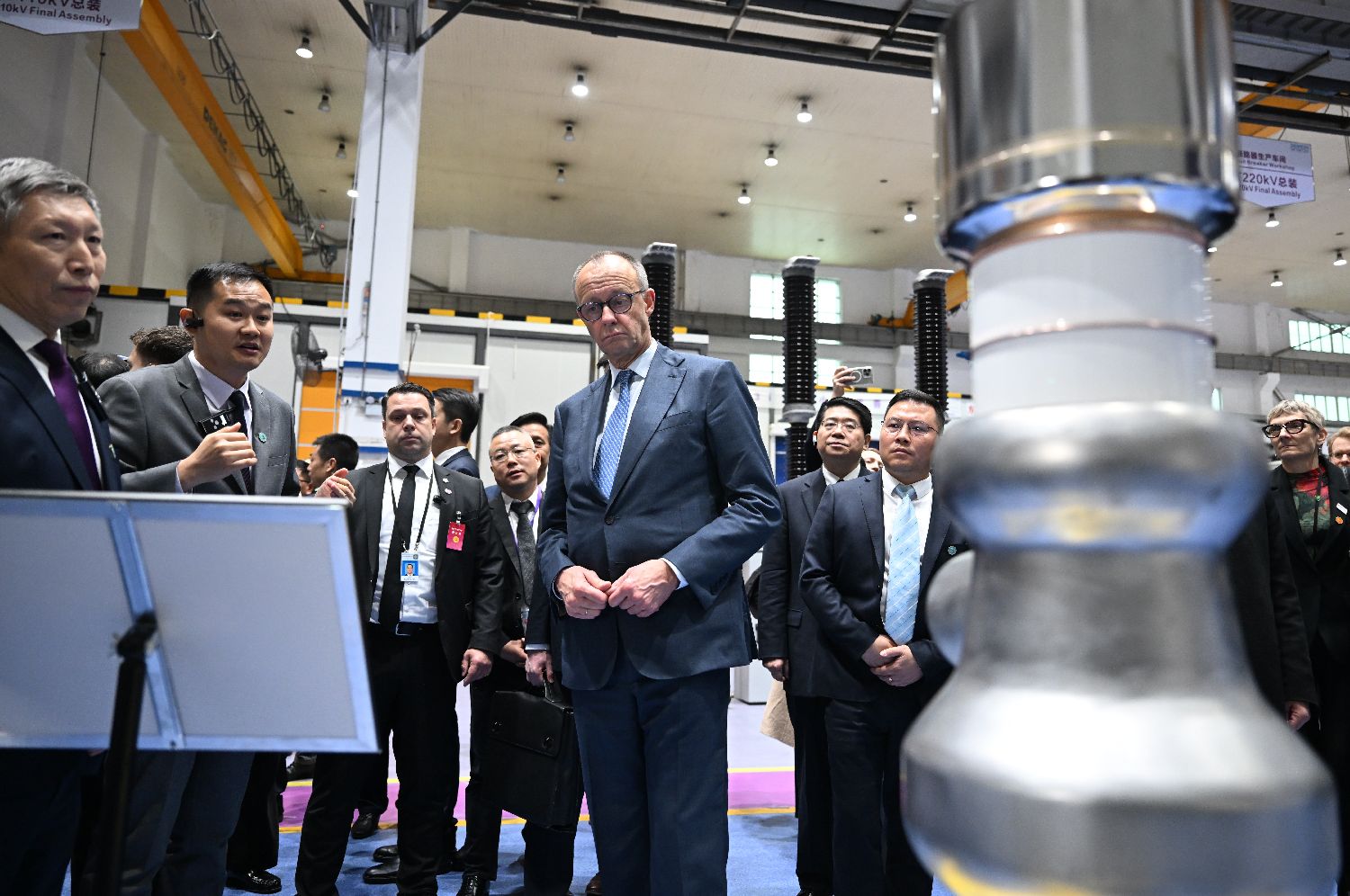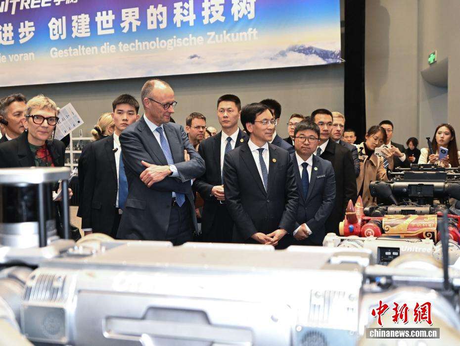 2月26日,德国总理默茨率近30位德国经济界代表组成的高级别代表团,在浙江杭州参访西门子能源公司及中国机器人企业宇树科技。图为默茨在西门子能源公司参观。中新社
