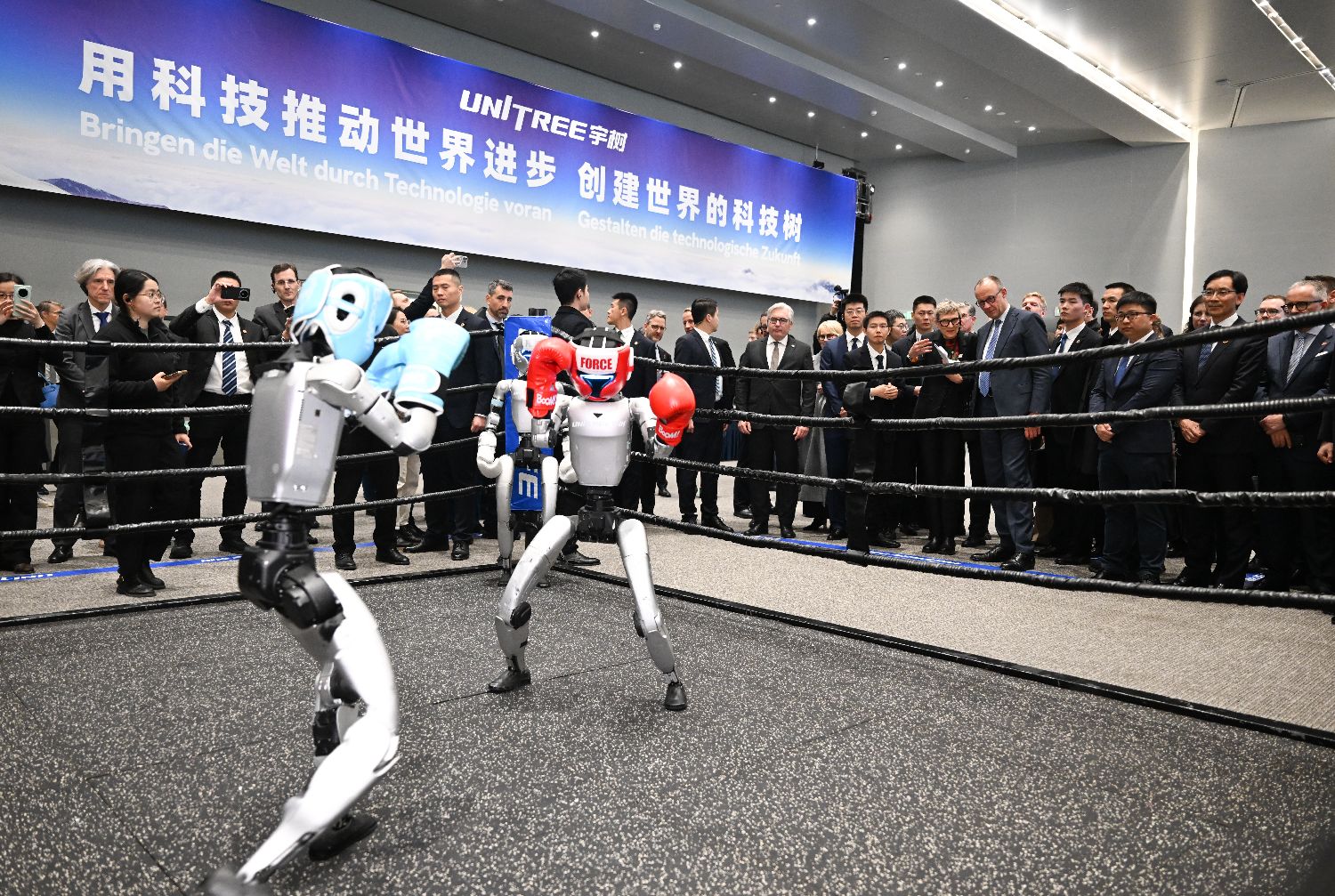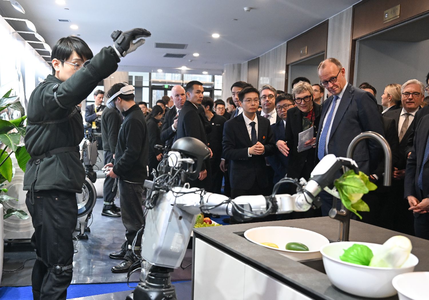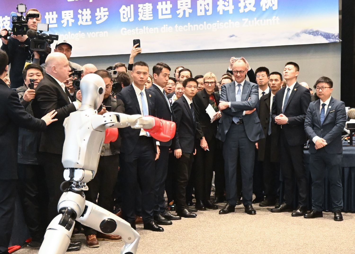 2月26日,德国总理默茨率近30位德国经济界代表组成的高级别代表团,在浙江杭州参访西门子能源公司及中国机器人企业宇树科技。图为默茨在西门子能源公司参观。中新社