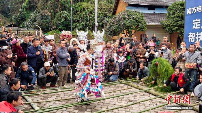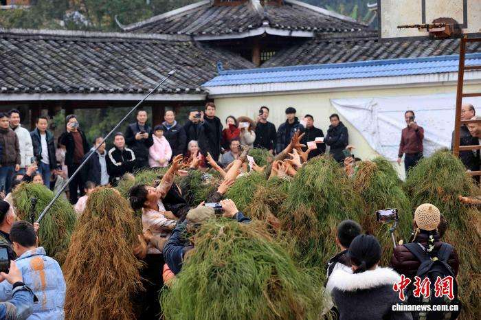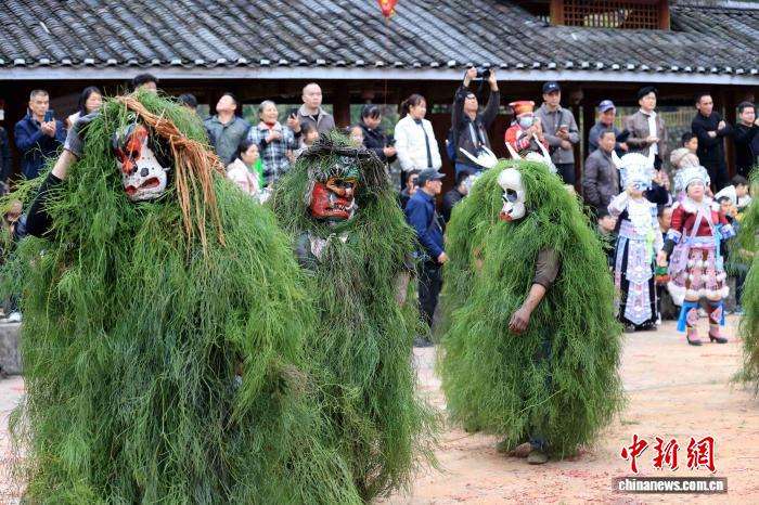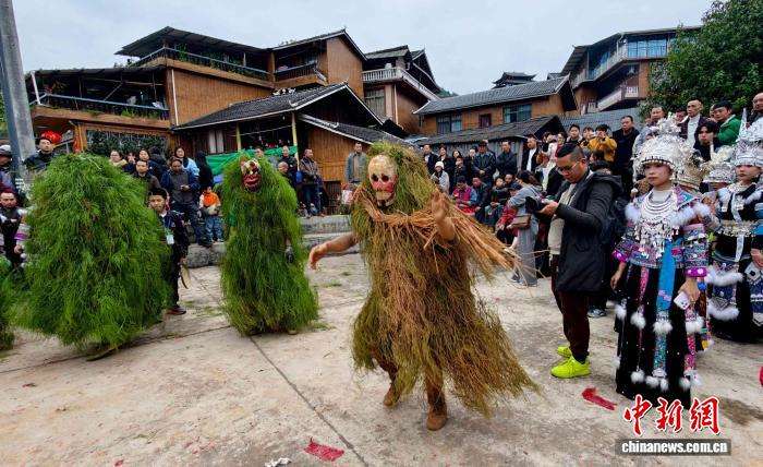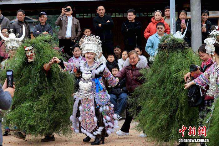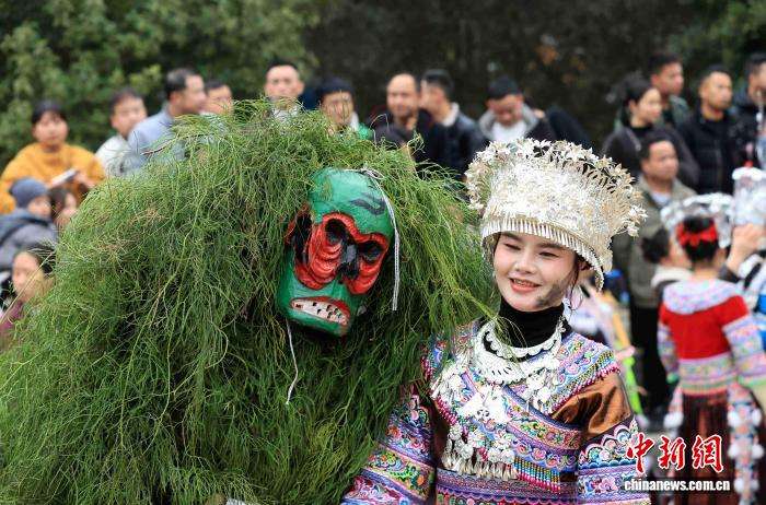 2月25日,在广西柳州融安县长安镇安宁村大袍屯,苗族民众欢庆传统节日“芒蒿节”。“芒蒿”相传是当地苗族民众的福神,苗族祖先用古树刻成面具,披着芒蒿藤制成的蓑衣,脸上涂抹黑灰扮演野人,成功抵御山匪侵扰。图为苗族民众和游客一起载歌载舞欢庆“芒蒿节”。