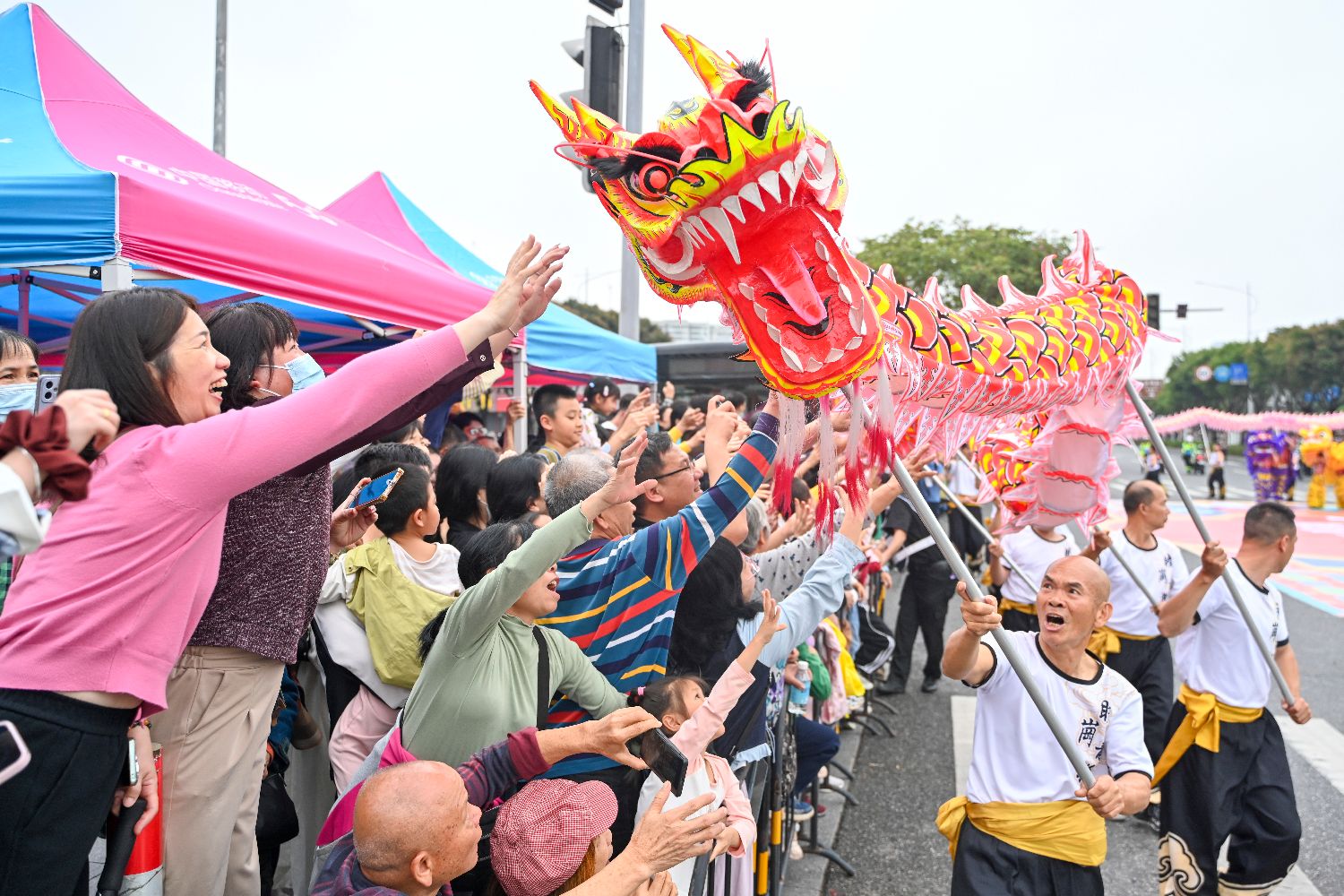 市民游客在活动上摸龙头图好意头。中新社