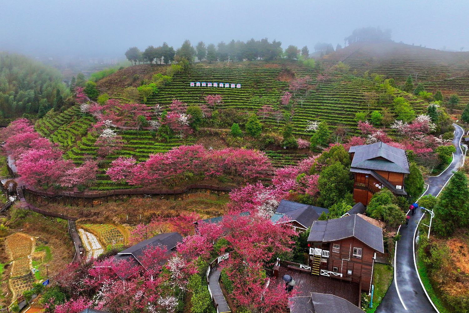 3月1日,大田县屏山乡有机生态茶园内,樱花竞相绽放,景致美不胜收。(无人机照片)中新社