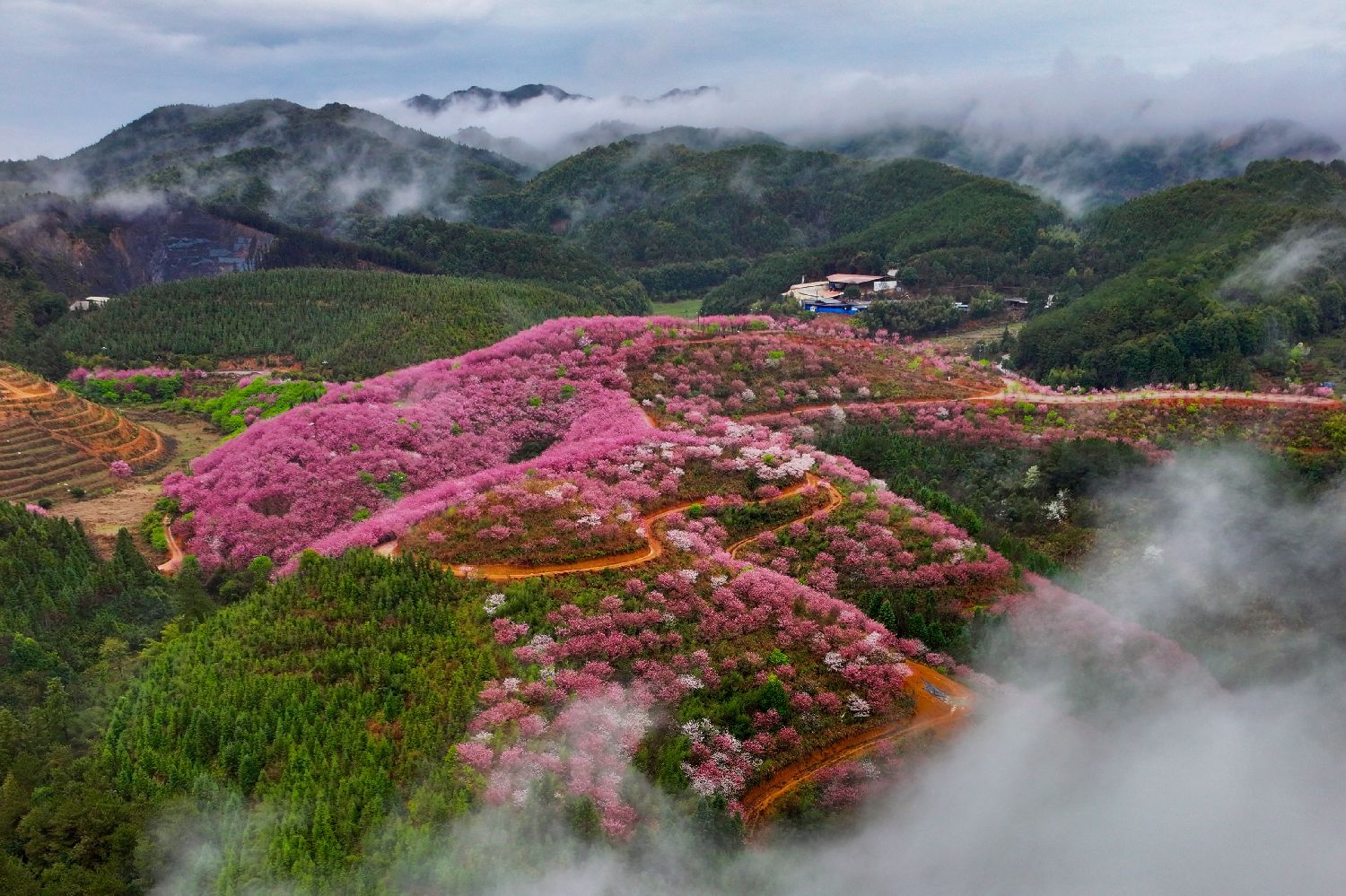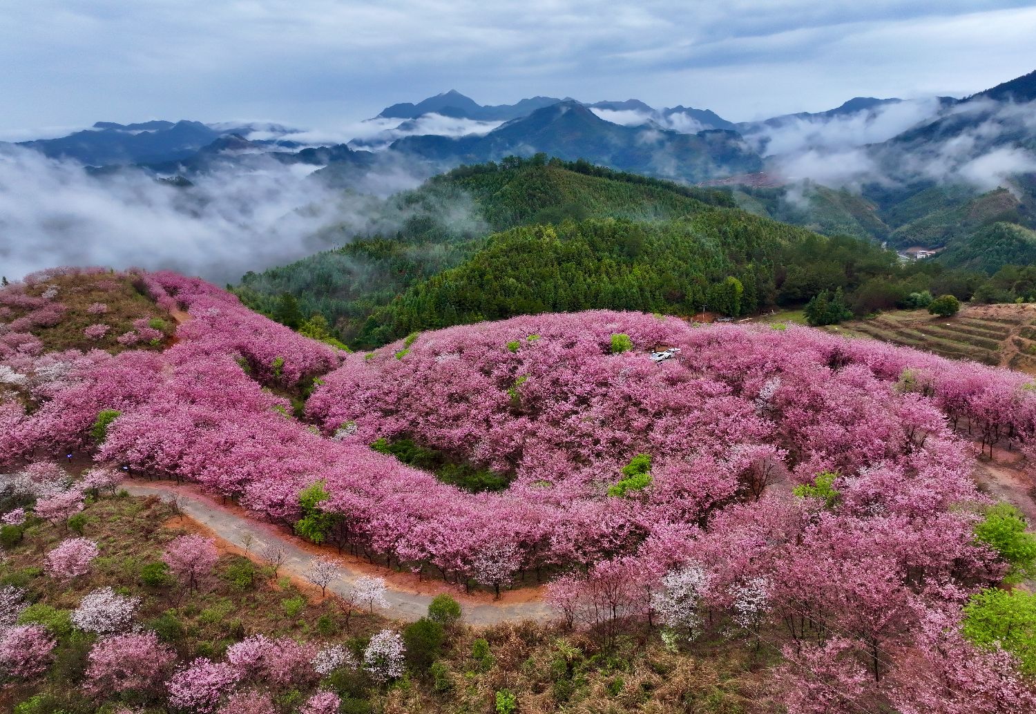 2月28日,大田县武陵乡樱花竞相绽放,景致美不胜收。(无人机照片)中新社