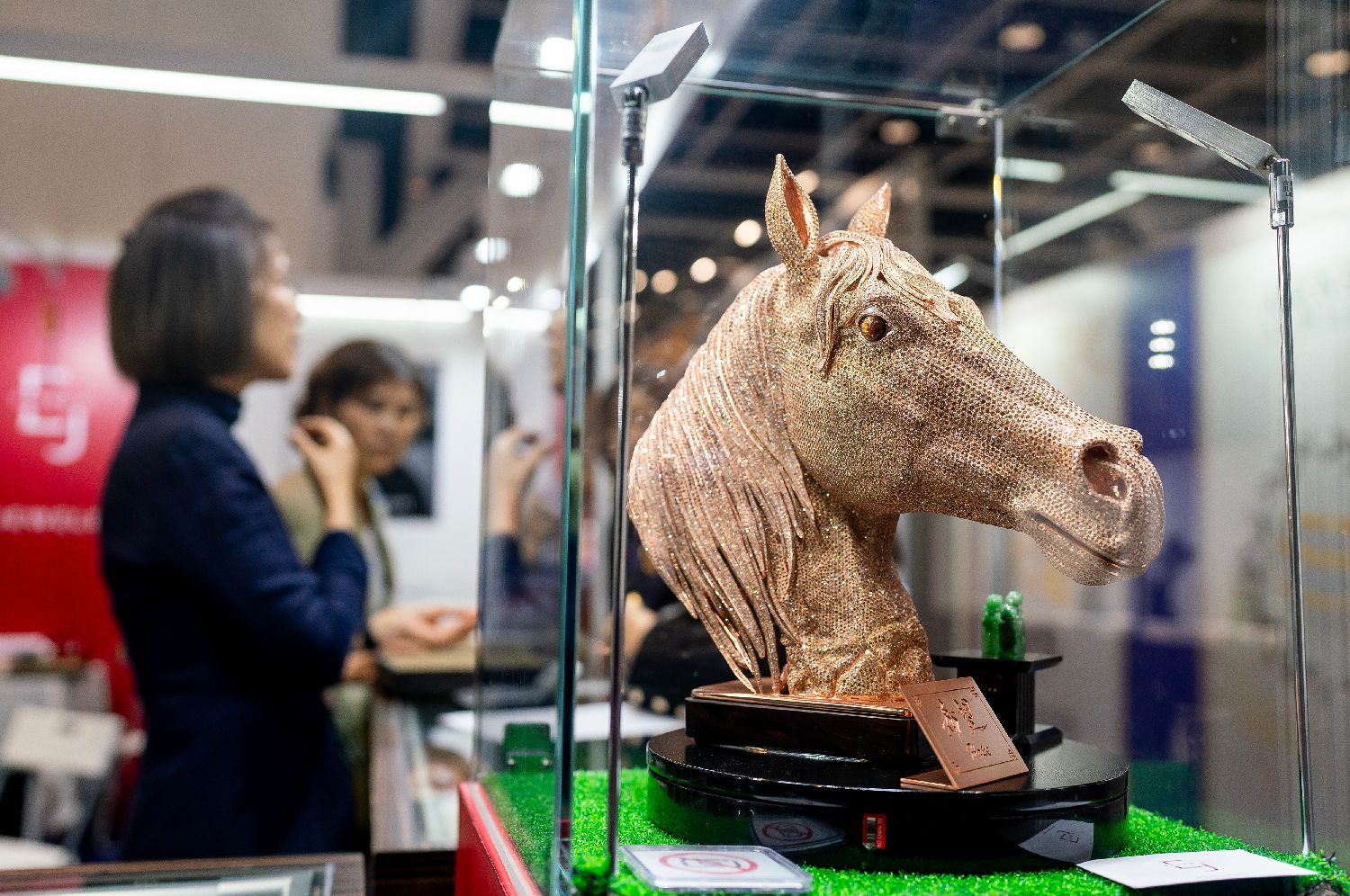 3月4日,由香港贸易发展局主办的第42届香港国际珠宝展在香港会议展览中心举行,并首设硬足金展馆。同时,第12届香港国际钻石、宝石及珍珠展已于3月2日在亚洲国际博览馆揭幕。两展云集逾40个国家和地区的约4000家展商,组成全球最大一站式珠宝商贸平台。展会现场人流不断,珠宝展位吸引众多买手驻足参观。图为参展商展出的“马首”珠宝装饰。香港中通社