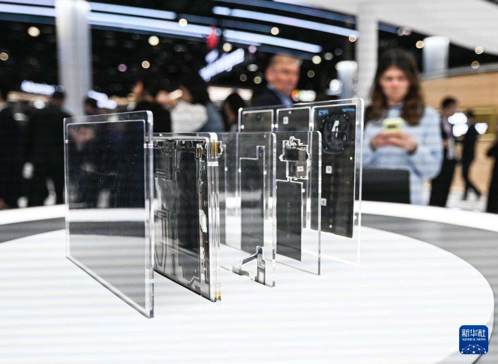3月3日,参观者在华为展台观看折叠屏手机的内部结构。