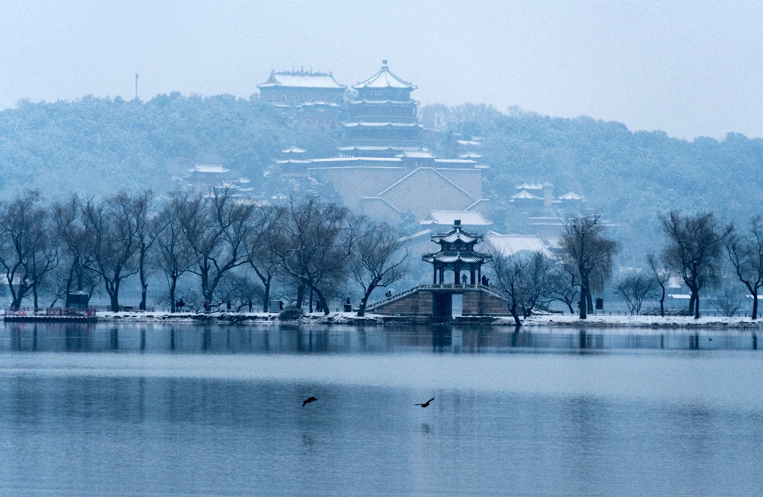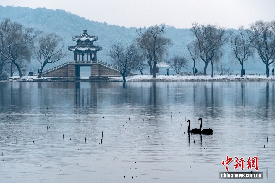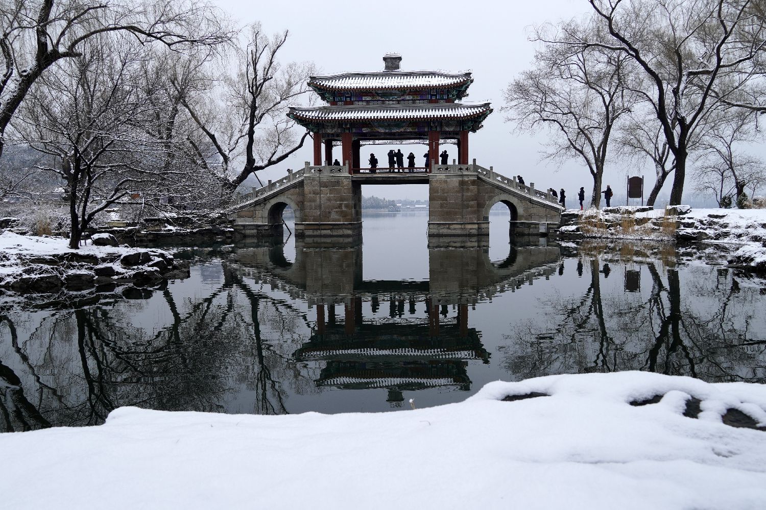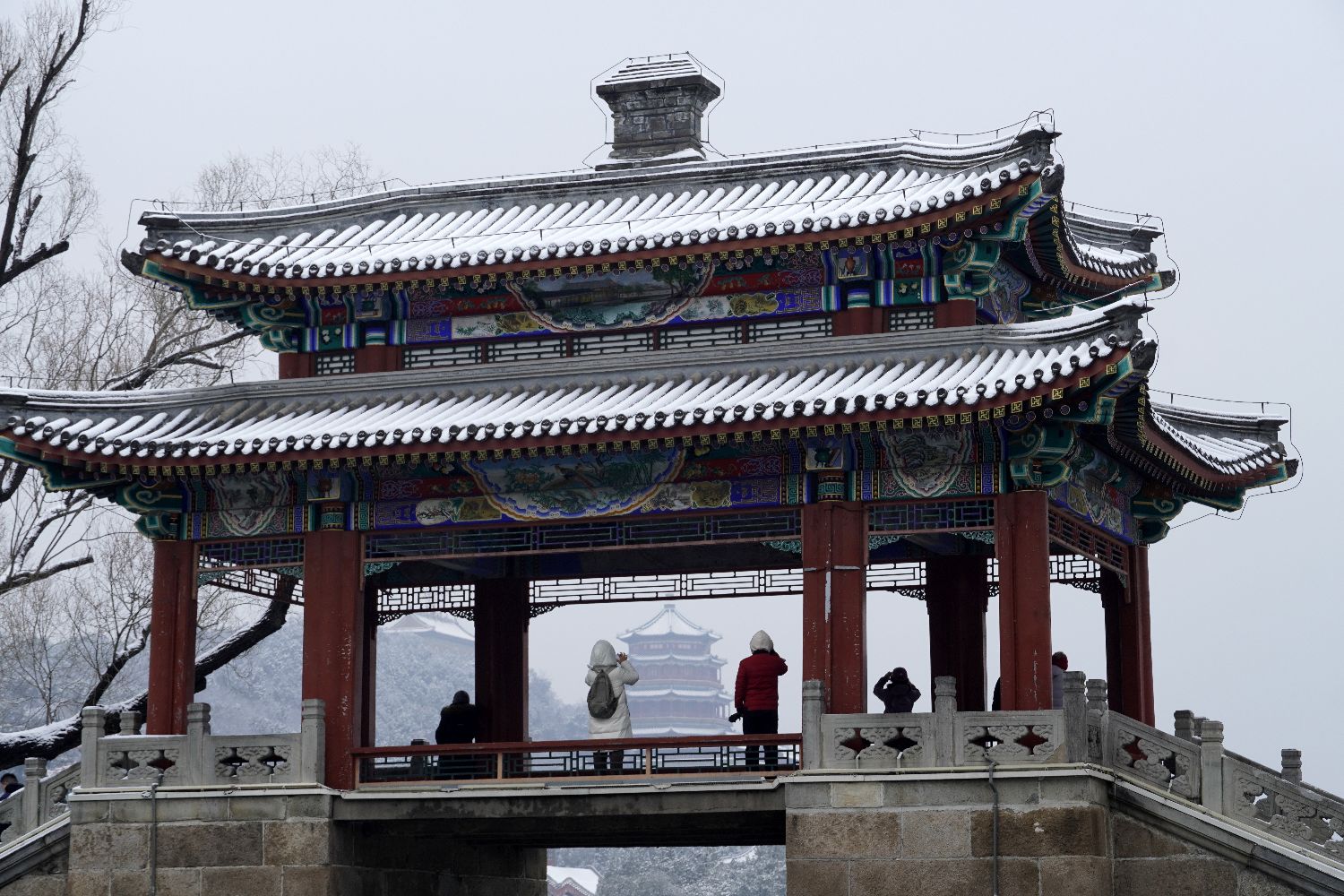 3月5日,北京迎来降雪,颐和园一片银装素裹,吸引众多游客前往赏雪拍照。图为雪后西堤吸引游客。中新社