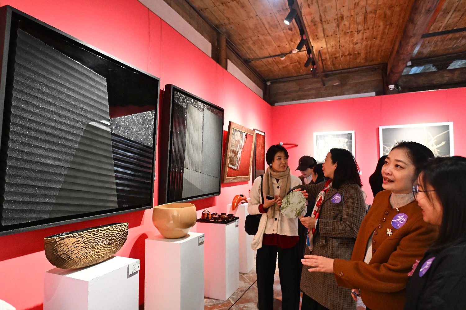 3月8日,中国各地洋溢着温馨氛围,各界以多样形式为女性送上节日祝福。图为崇本·国际女性漆艺环保展在位于福建福州的福建省沈绍安漆艺博物馆开幕,吸引民众观展。图为参观者参观展出的漆艺作品。中新社