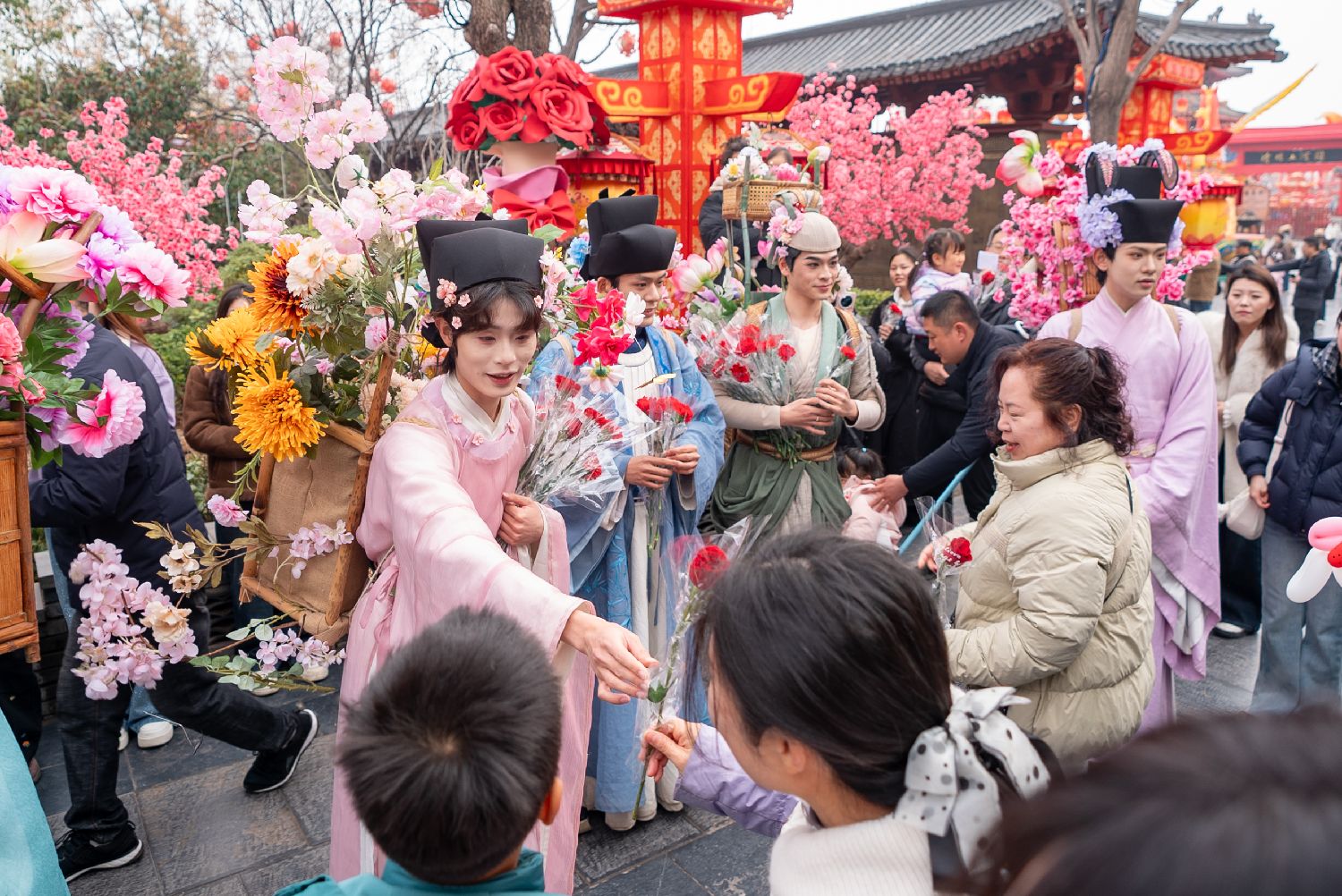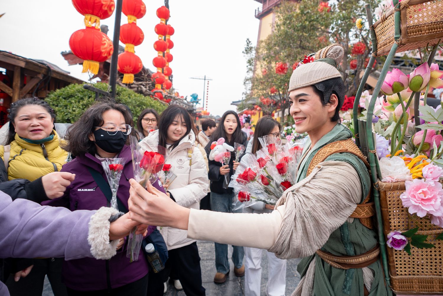 3月8日,河南开封清明上河园景区的“簪花郎”为过往女性游客送上玫瑰花,并致以节日祝福。中新社