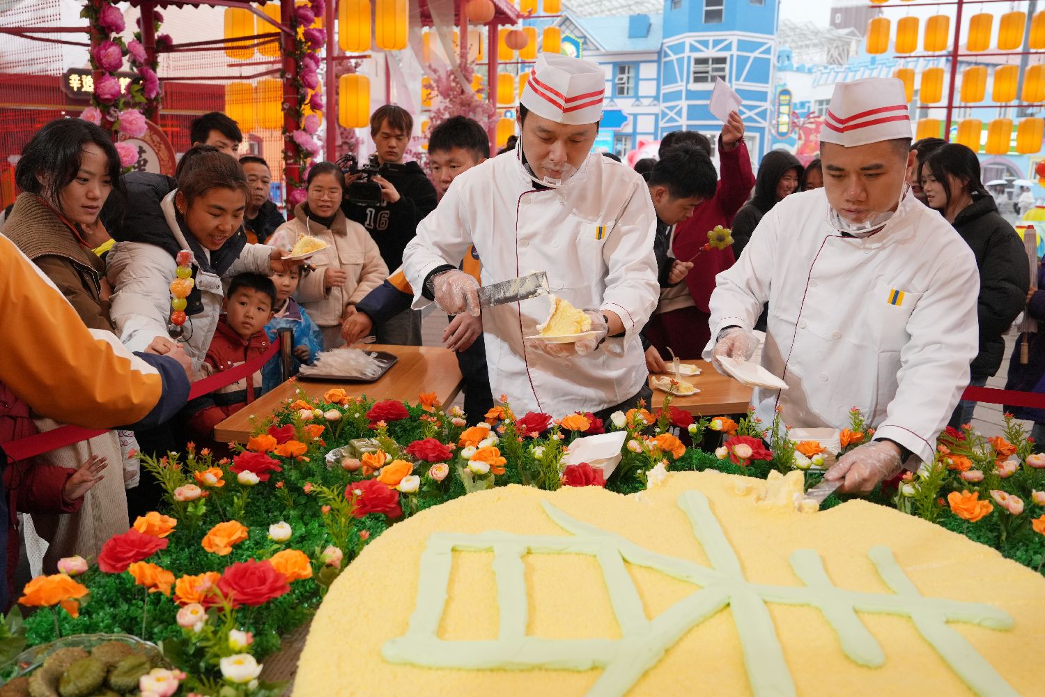 湖南长沙世界之窗的百人春日宴现场,工作人员为游客分春饼。中新社