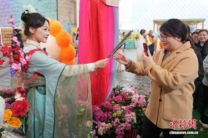 湖南长沙世界之窗的百人春日宴活动现场,工作人员为女性游客赠送鲜花。中新网