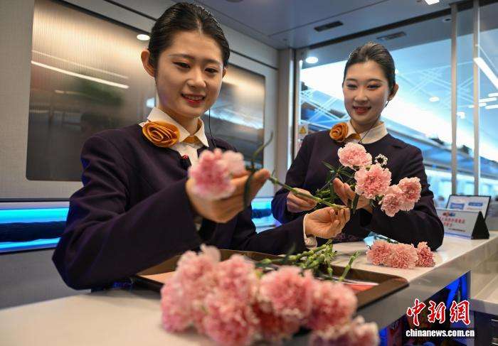 3月8日,中国铁路沈阳局集团有限公司沈阳客运段动车一队G146次列车沈阳北至北京的车厢里秒变浪漫现场,列车长、乘务员化身“宠粉天团”,手持鲜花穿梭车厢,为女性旅客送上惊喜祝福。图为列车员在准备鲜花。中新网