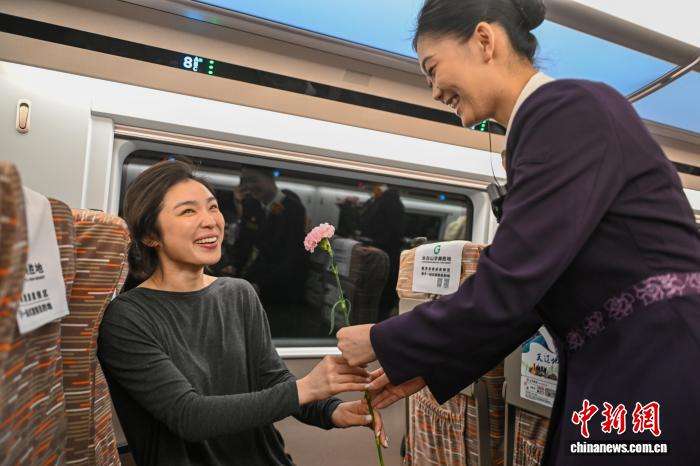 列车员给旅客送上鲜花并送上节日的祝福。中新网