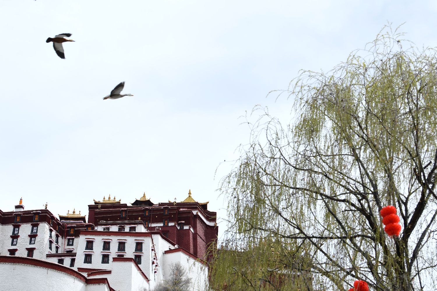 近日,西藏拉萨杨柳发芽、桃花初放,春意渐浓。图为3月8日,拉萨宗角禄康公园,杨柳吐绿。中新社