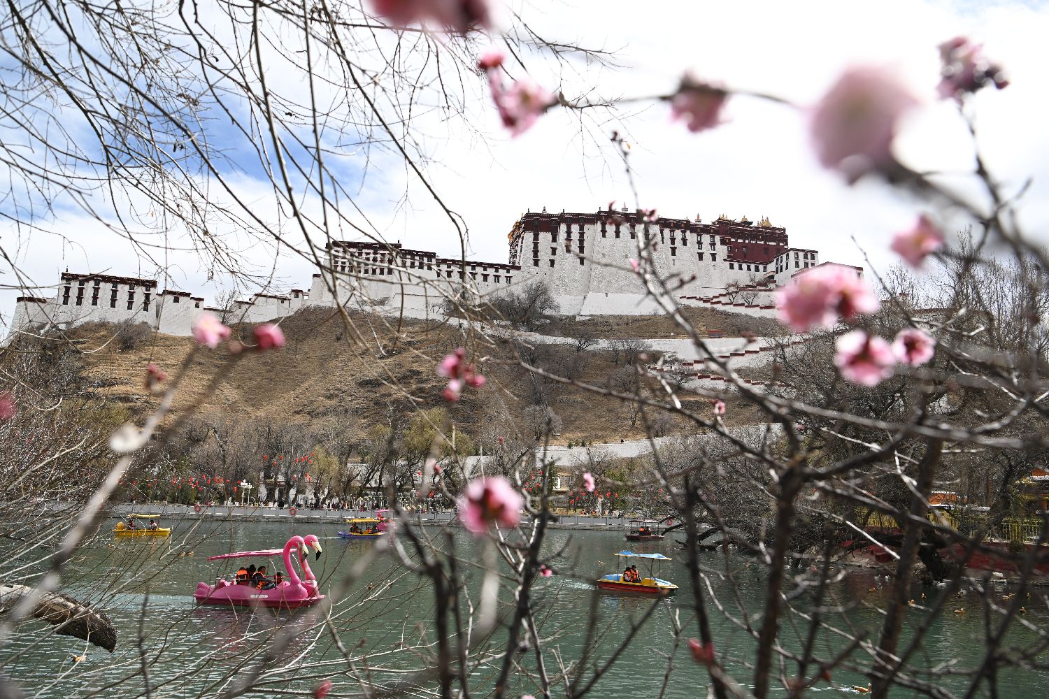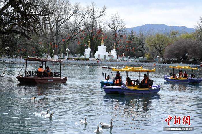 3月8日,拉萨宗角禄康公园,市民乘游船赏春。中新网