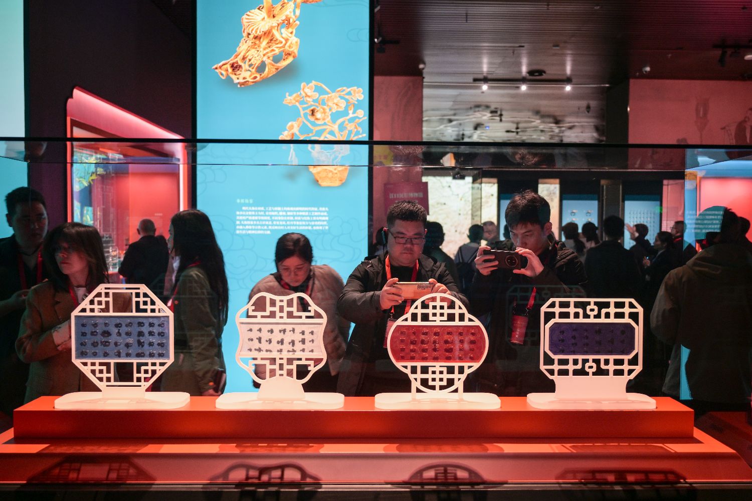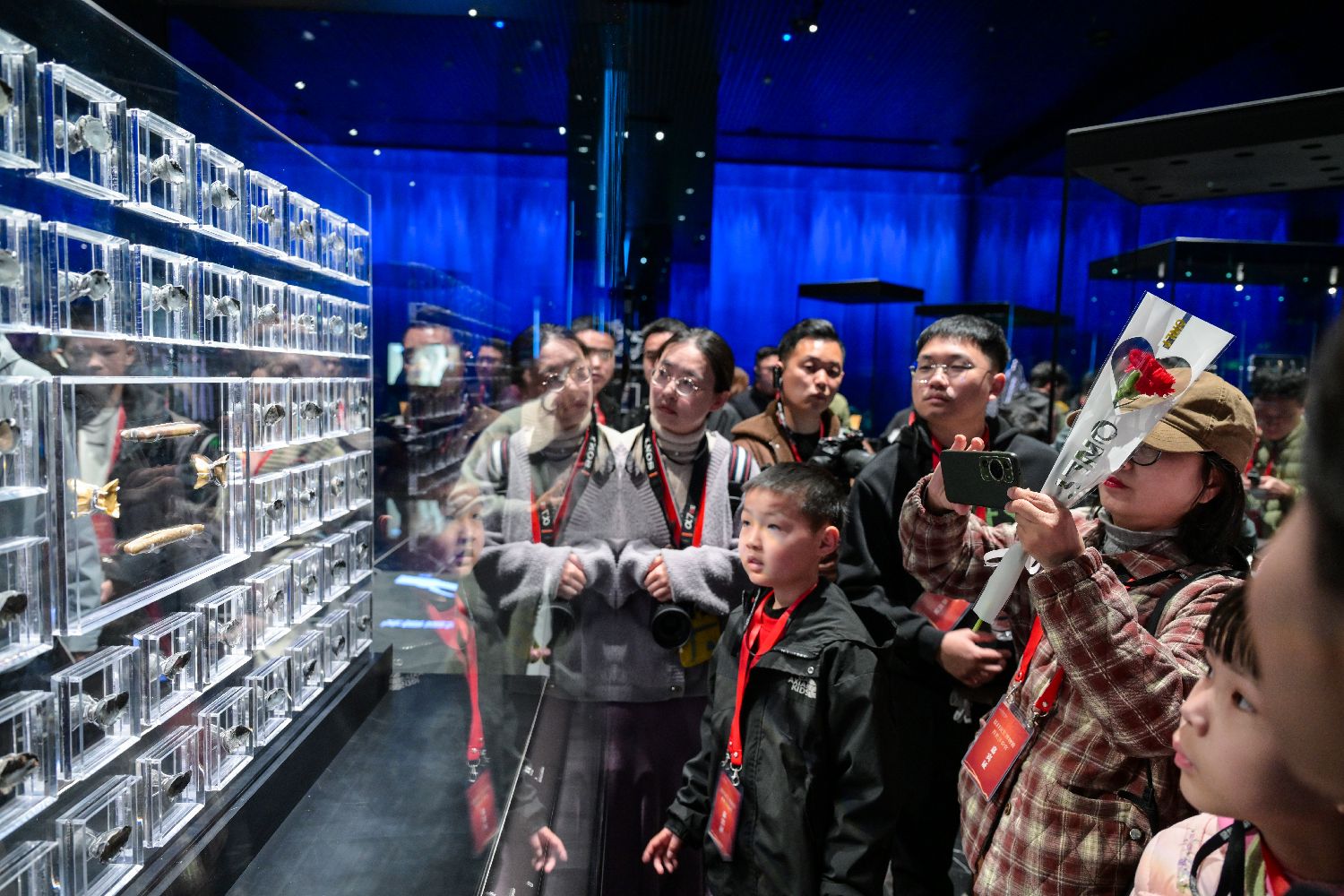 3月8日,四川省眉山市彭山区江口沉银博物馆迎首批预约观众。此次参观实行限额免费预约制,共接待1000名观众。江口沉银博物馆以展陈金银器为核心,共陈列文物7000余件,是中国首个以金银器为专题的博物馆。图为参观者在博物馆内打卡拍照。中新社