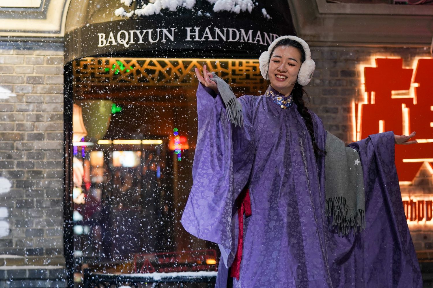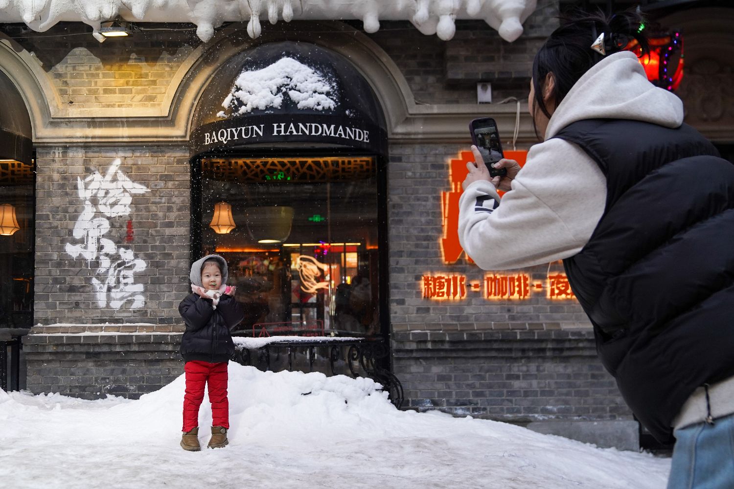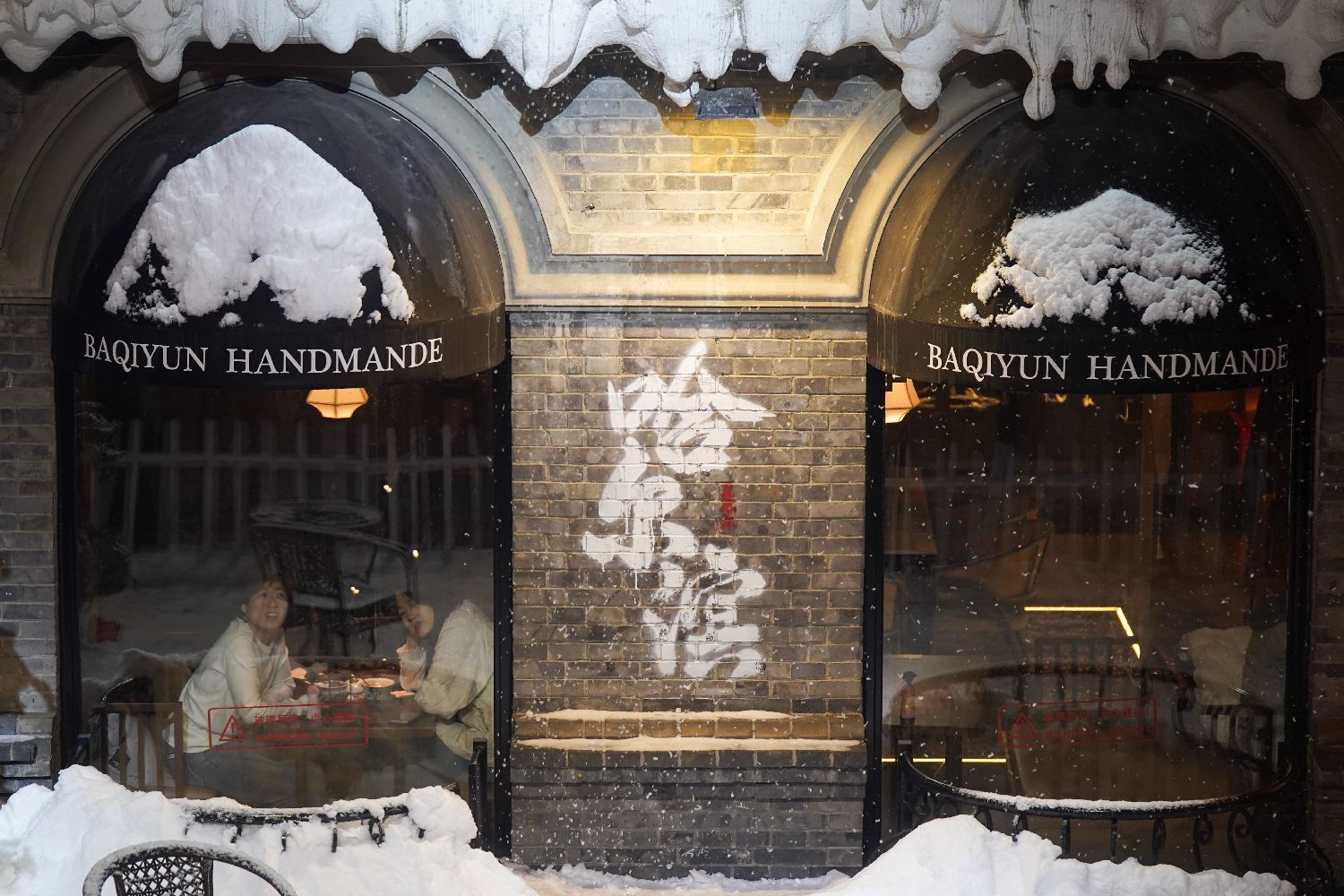 在黑龙江省哈尔滨市中华巴洛克历史文化街区内,飘雪小院凭借跨越四季的人造落雪景观,成为游客的热门打卡地,小院的飘雪景观打破了季节限制,实现365天全天候“降雪”,游客无论何时到访,都能沉浸式体验哈尔滨的雪韵浪漫。图为3月10日,游客在飘雪小院的餐厅内欣赏雪景。