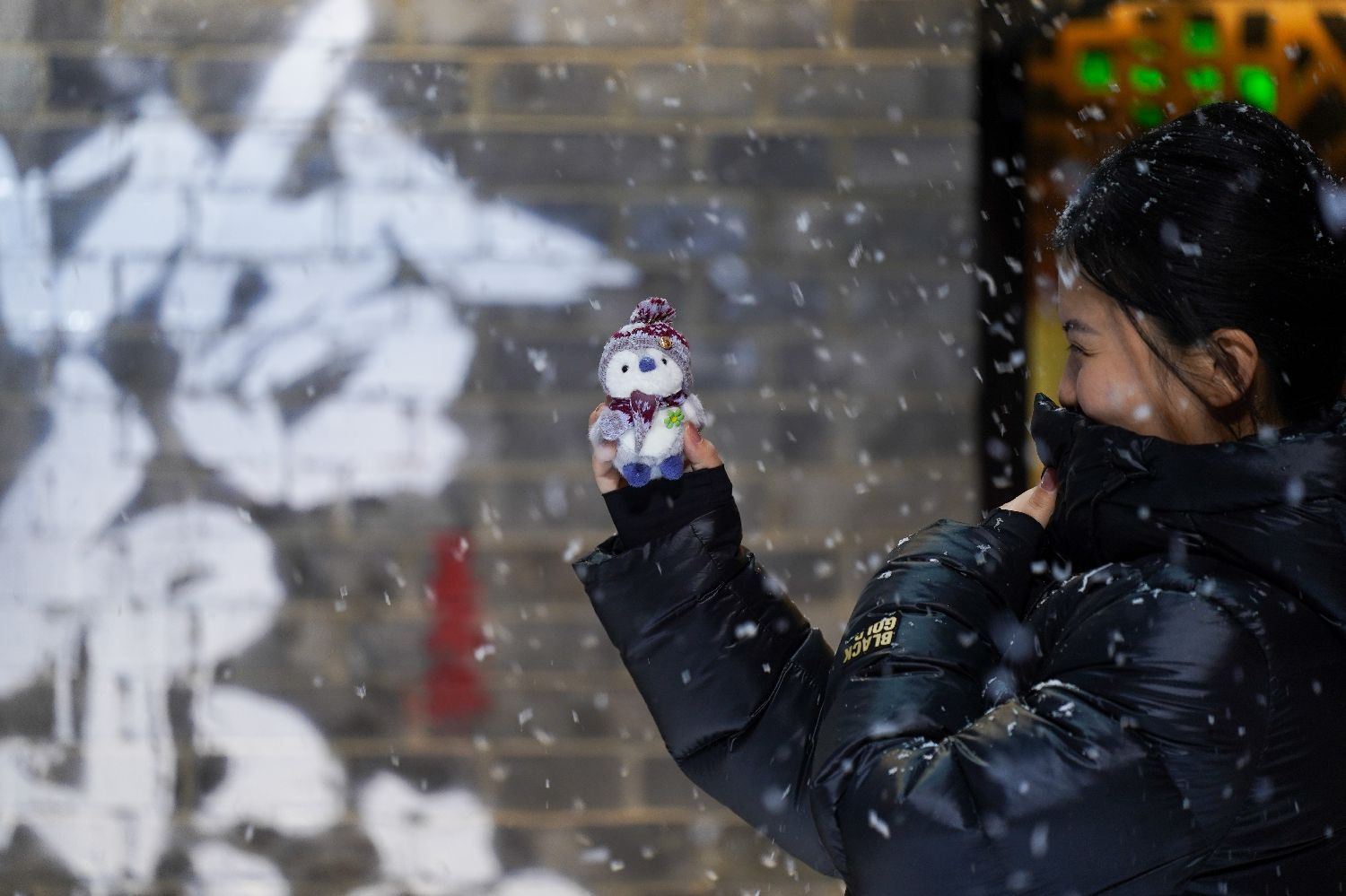 3月10日,一名游客拿着玩偶在飘雪小院打卡。