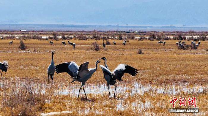 3月10日,在柴达木盆地的青海都兰县,灰鹤在湿地中嬉戏。