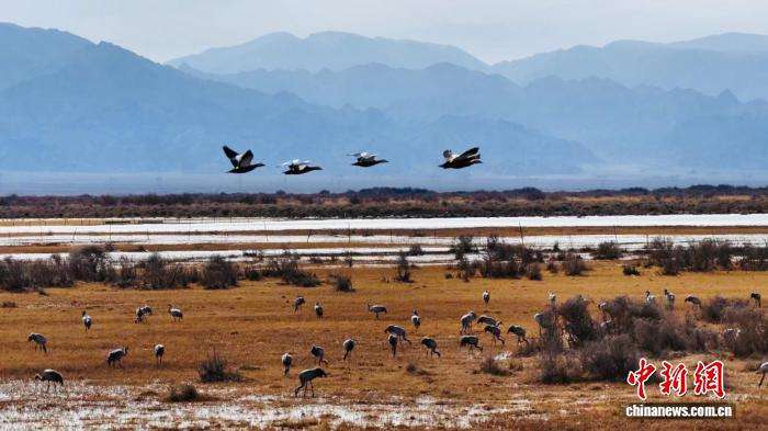 3月10日,在柴达木盆地的青海都兰县,灰鹤在湿地上空飞舞。