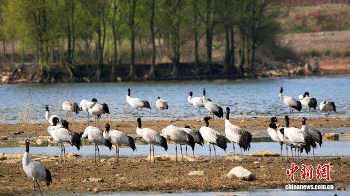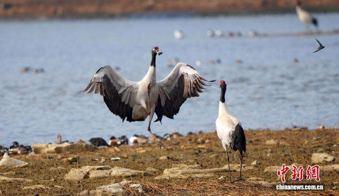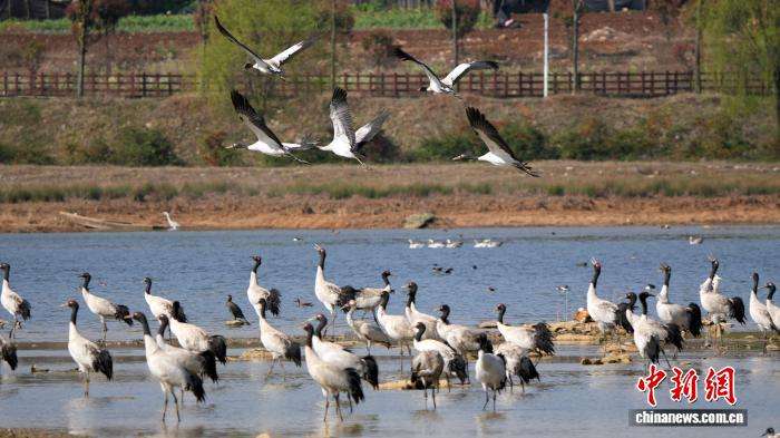 随着气候渐暖,贵州省毕节市威宁彝族回族苗族自治县草海国家级自然保护区迎来候鸟北迁的高峰期。图为3月10日,在草海国家级自然保护区拍摄到的黑颈鹤。