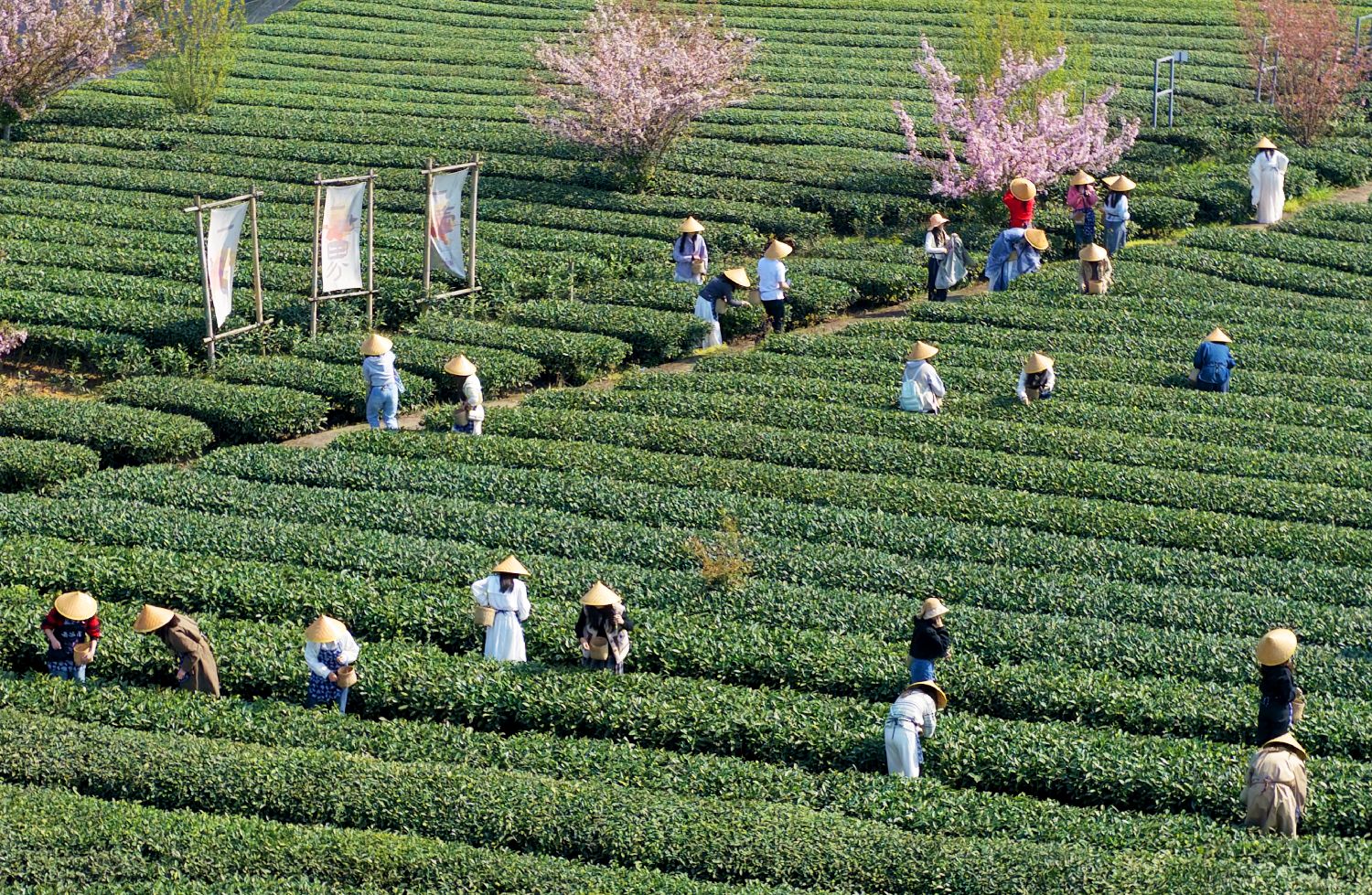 近日,随着天气变暖,四川成都蒲江进入春茶采摘季。图为3月11日,在成都市蒲江县成佳镇圣茶社区炮林山茶叶示范基地的茶园里,茶农忙着采摘新茶。中新社