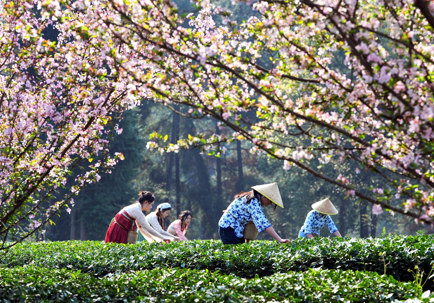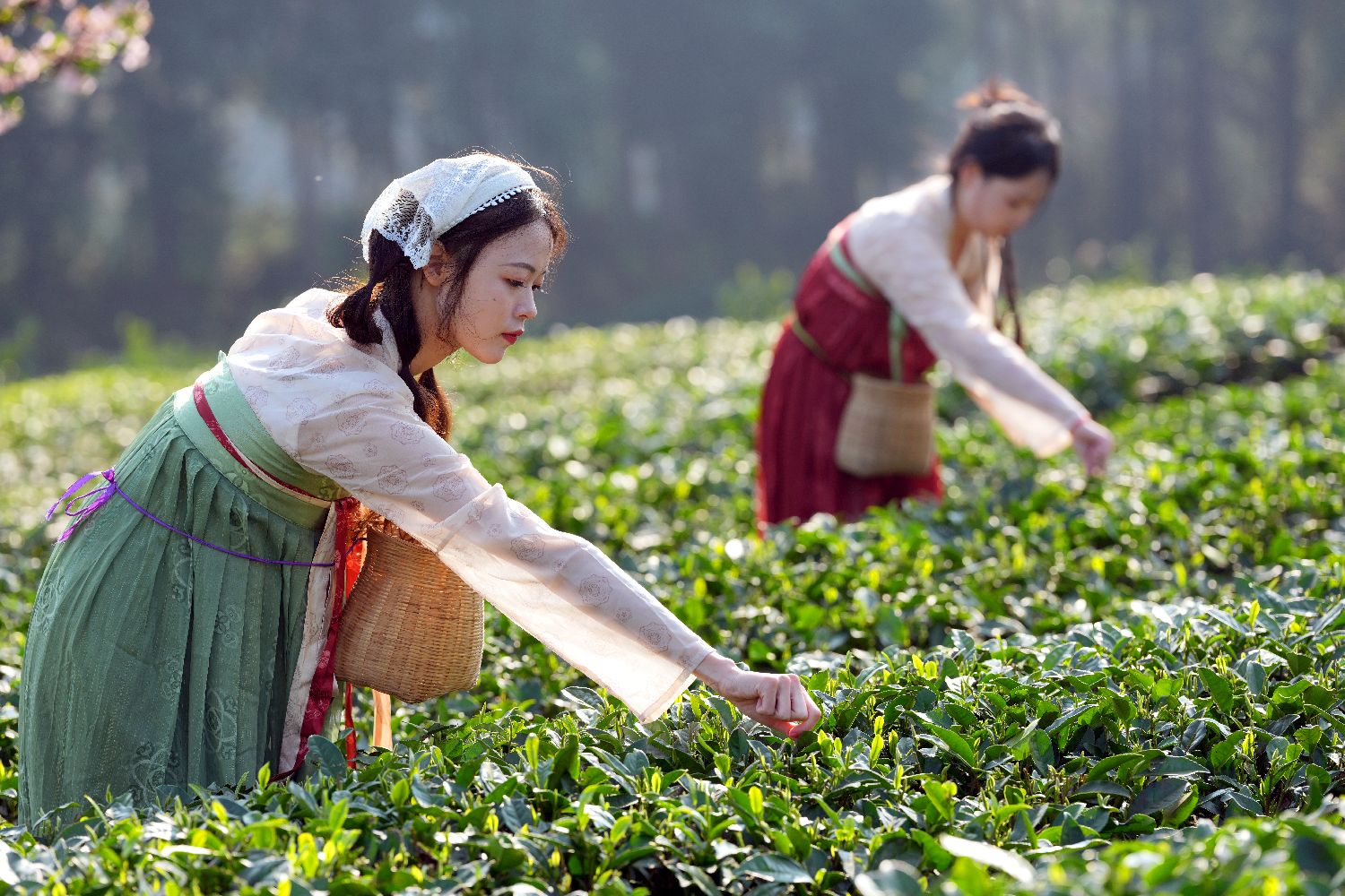 3月11日,在成都市蒲江县成佳镇圣茶社区炮林山茶叶示范基地的茶园里,游客身着古装在茶园体验春茶采摘。中新社