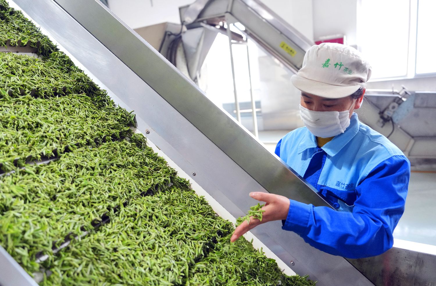 3月11日,在成都市蒲江县成佳镇四川嘉竹茶业有限公司,车间里的工人对新茶进行杀青工艺处理。中新社