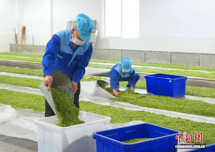 3月11日,在成都市蒲江县成佳镇四川嘉竹茶业有限公司车间里,工人对新茶进行萎凋工艺处理。中新网