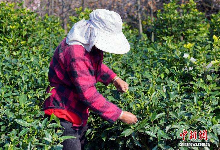 3月11日,在成都市蒲江县成佳镇圣茶社区炮林山茶叶示范基地的茶园里,茶农忙着采摘新茶。中新网